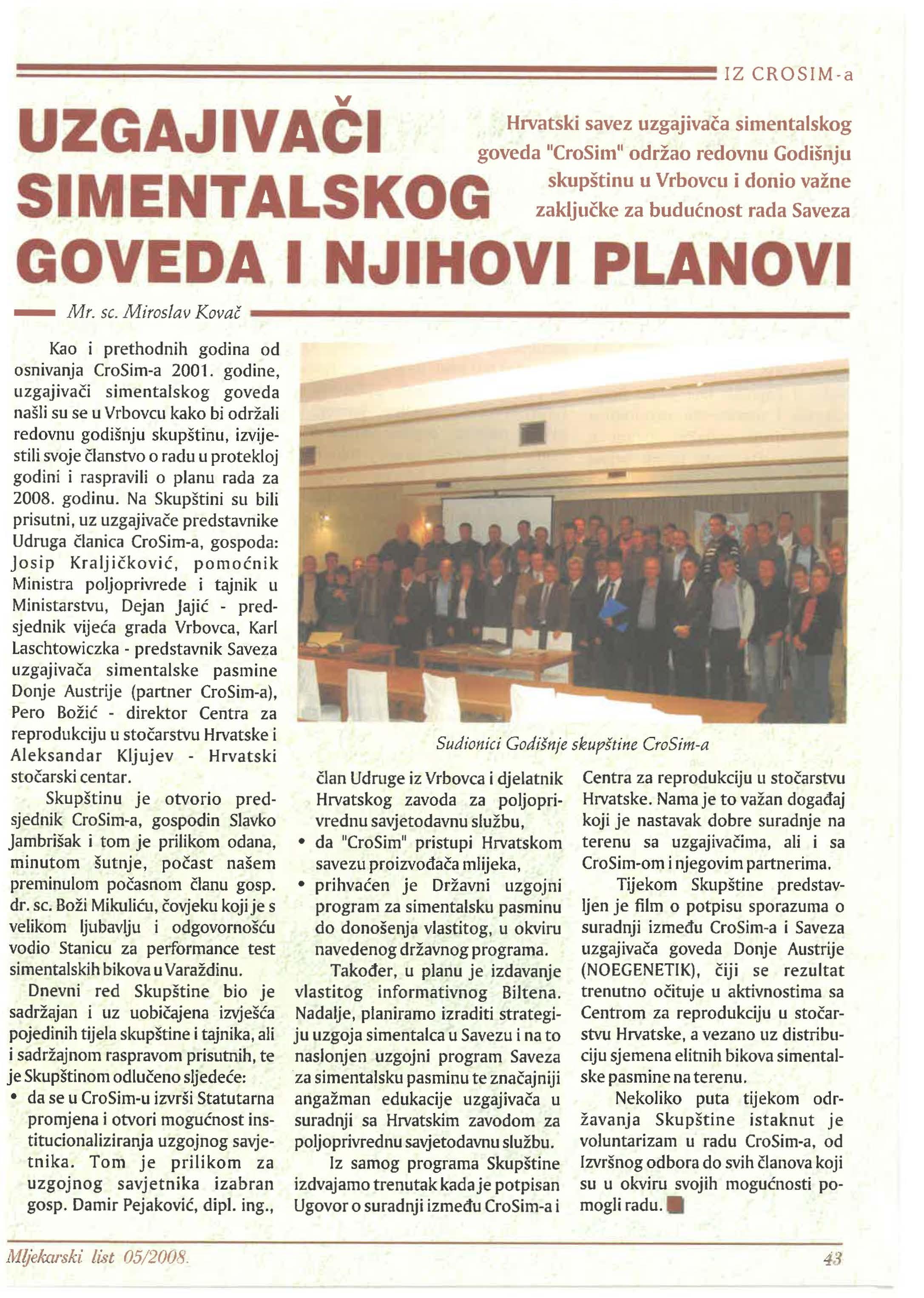 prijenos iskustava koje ima Austrija. Jedan oblik suradnje, u realizaciju je CroSim odmah krenuo, je i upotrebe sjemena bikova koje koriste u Austriji. Hrvatski organizirani kroz CroSim, dobili su priliku odabrati elitne bikove kojima osjemenjivati plotkinje na svojim farmama. Upravo realizacija tog dijela suradnje dovela je CroSim do Centra za reprodukciju u Hrvatske d.o.o., koji ima ovlasti uvoza genetskog materijala. Uslijedilo je nekoliko sastanaka predstavnika institucija. Ispred CroSima gosp. Slavko Jambrišak, ing. i lvan Hajdina predložili su Sporazum o