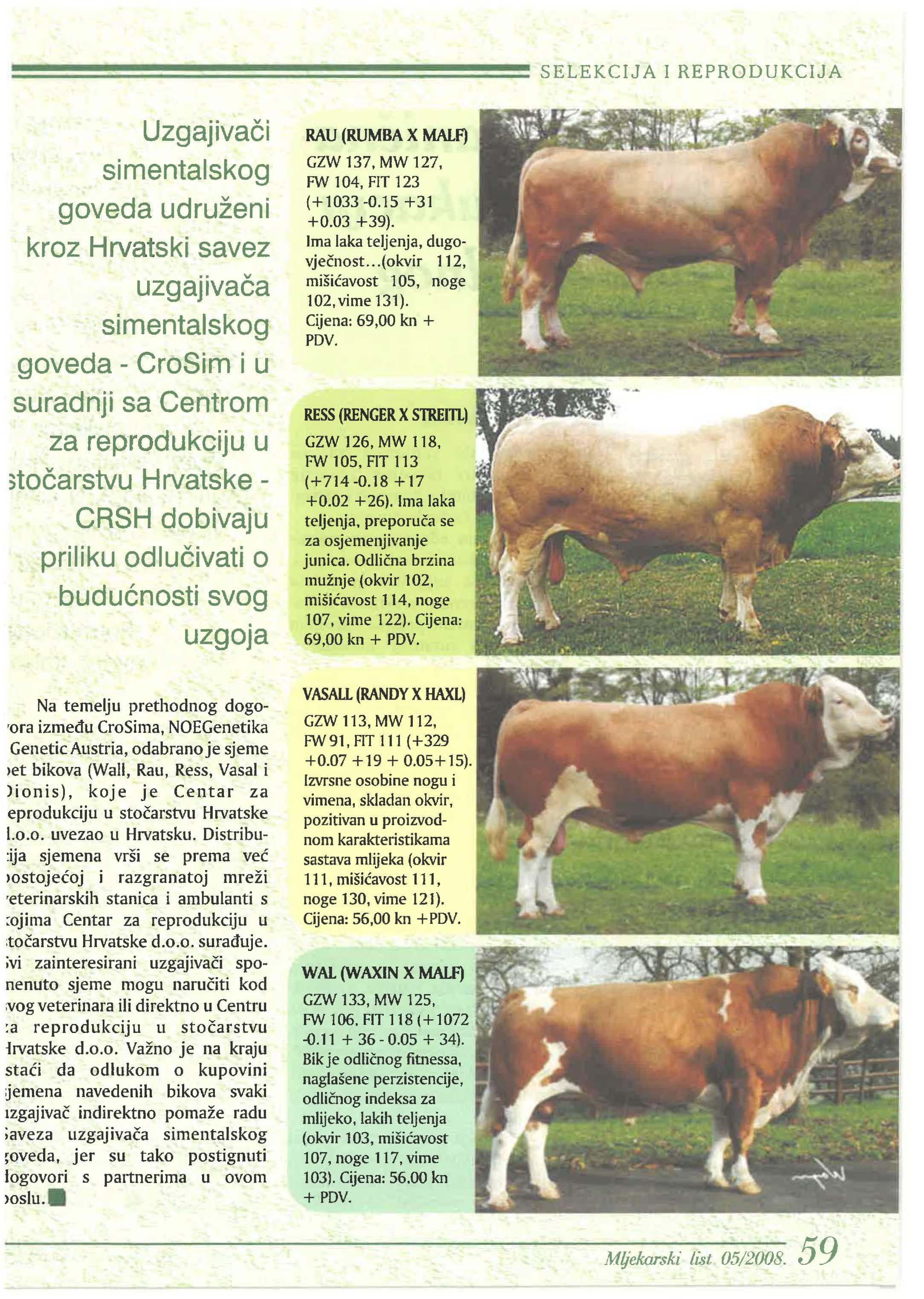 Na temelju prethodnog dogo'ora CroSima, NOEGenetika GeneticAustria, odabrano je sjeme ,et bikova (Wall, Rau, Ress, Vasal i )ionis), koje je Centar za eprodukciju u Hrvatske I.o.o. uvezao u Hrvatsku. Distribu:ija sjemena vrši se prema i razgranatoj mreži 'eterinarskih stanica i ambulanti s :ojima Centar za reprodukciju u Hrvatske d.o.o. ivi zainteresirani sponenuto sjeme mogu kod ;vog veterinara ili direktno u Centru :a reprodukciju u 1rvatske d.o.o. Važno je na kraju da odlukom o kupovini ;jemena navedenih bikova svaki indirektno pomaže radu ;aveza simentalskog :oveda, jer su tako postignuti logovori s partnerima u ovom