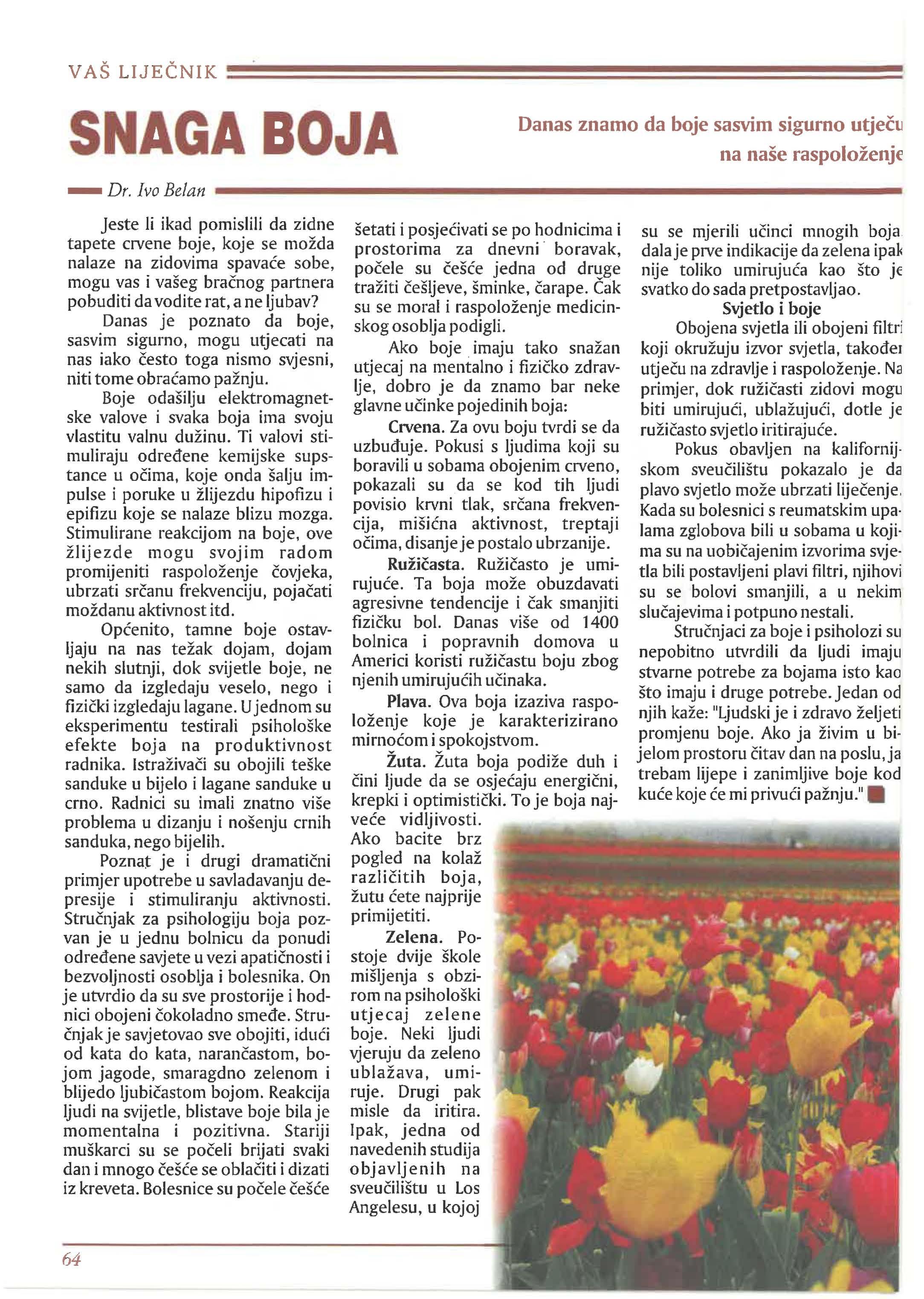 Pokus obavijen na kalifornijskom pokazalo je da plavo svjetlo može ubrzati Kada su bolesnici s reumatskim upalama zglobova bili u sobama u kojima su na izvorima svje· tla bili postavljeni plavi filtri, njihovi su se bolovi smanjili, a u nekim i potpuno nestali. za boje i psiholozi su nepobitno utvrdili da ljudi imaju stvarne potrebe za bojama isto kao što imaju i druge potrebe. Jedan od njih kaže: "Ljudskije i zdravo željeti promjenu boje. Ako ja živim u bijelom prostoru dan na poslu,ja trebam lijepe i zanimljive boje kod koje mi