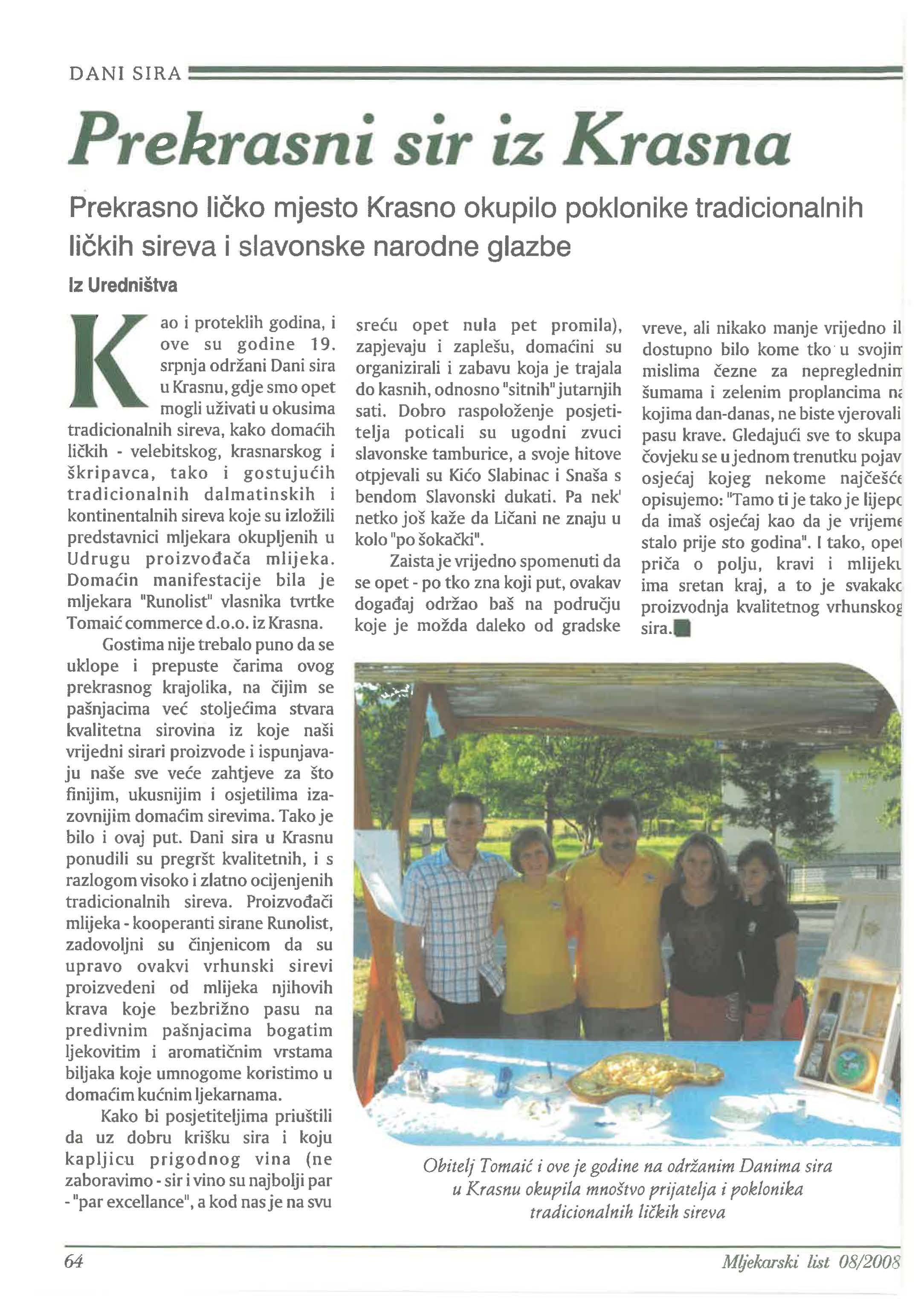 I(ao i proteklih godina, i ove su godine 19. srpnja održa_niDani sira u Krasnu, gdJe smo opet mogli uživati u okusima tradicionalnih sireva, kako - velebitskog, krasnarskog i škripavca, tako i tradicionalnih dalmatinskih i kontinentalnih sireva koje su izložili predstavnici mljekara okupljenih u Udrugu mlijeka. manifestacije bila je mljekara "Runolist" vlasnika tvrtke commerce d.o.o. iz Krasna. Gostima nije trebalo puno da se uklope i prepuste ovog prekrasnog krajolika, na se pašnjacima stvara kvalitetna sirovina iz koje naši vrijedni sirari proizvode i ispunjavaju naše sve zahtjeve za što finijim, ukusnijim i osjetilima izazovnijim sirevima. Tako je bilo i ovaj put. Dani sira u Krasnu ponudili su pregršt kvalitetnih, i s razlogom visoko i zlatno ocijenjenih tradicionalnih sireva. mlijeka - kooperanti sirane Runolist, zadovoljni su da su upravo ovakvi vrhunski sirevi proizvedeni od mlijeka njihovih krava koje bezbrižno pasu na predivnim pašnjacima bogatim ljekovitim i vrstama biljaka koje umnogome koristimo u ljekarnama.