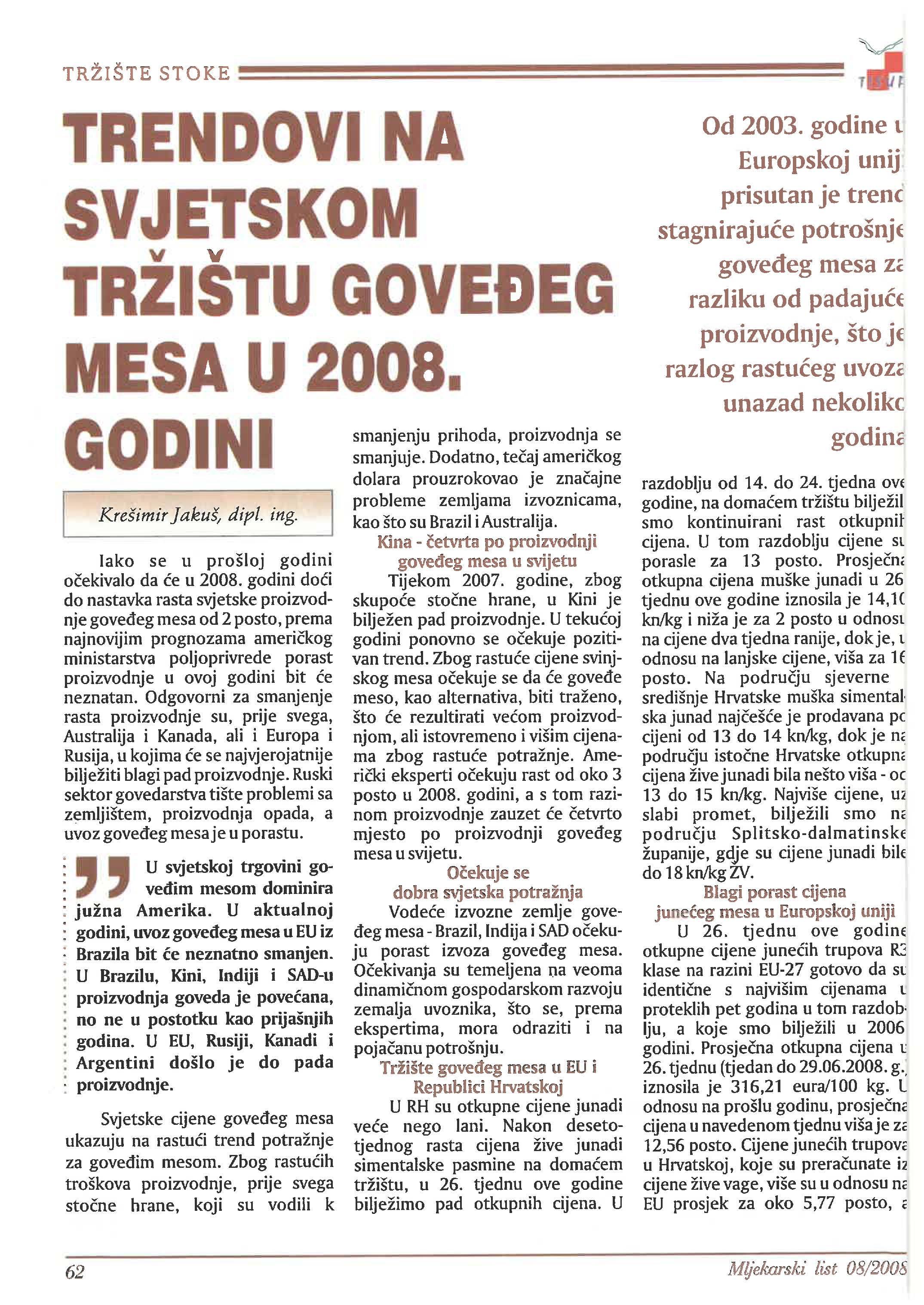 lako se u prošloj godini da u 2008. godini do nastavka rasta svjetske proizvodnje mesa od 2 posto, prema najnovijim prognozama ministarstva poljoprivrede porast proizvodnje u ovoj godini bit neznatan. Odgovorni za smanjenje rasta proizvodnje su, prije svega, Australija i Kanada, ali i Europa i Rusija, u kojima se najvjerojatnije bilježiti blagi pad proizvodnje. Ruski sektor govedarstva tište problemi sa zemljištem, proizvodnja opada, a uvoz mesa je u porastu.
