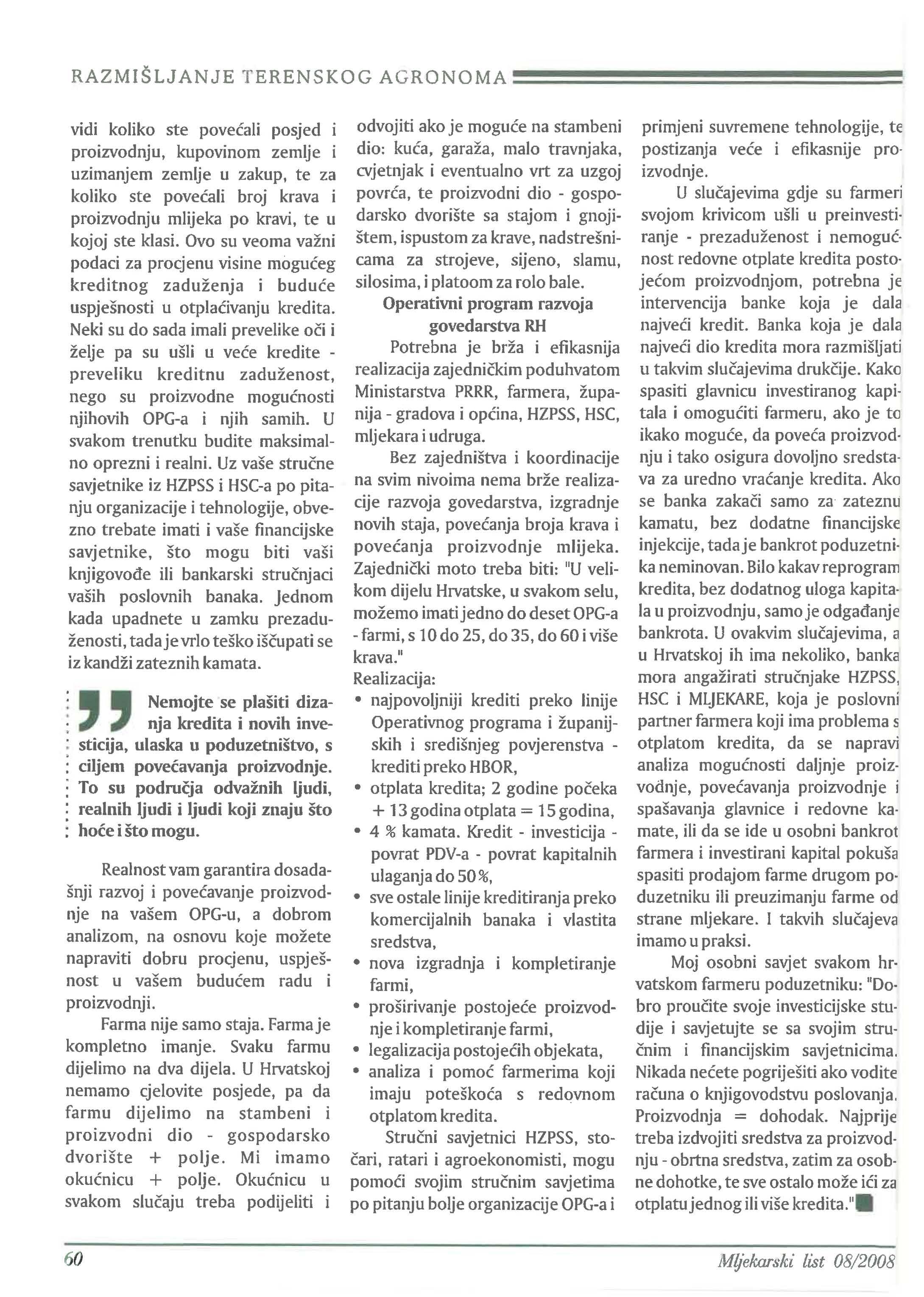vidi koliko ste posjed i proizvodnju, kupovinom zemlje i uzimanjem zemlje u zakup, te za koliko ste broj krava i proizvodnju mlijeka po kravi, te u kojoj ste klasi. Ovo su veoma važni podaci za procjenu visine kreditnog zaduženja i uspješnosti u kredita. Neki su do sada imali prevelike i želje pa su ušli u kreditepreveliku kreditnu zaduženost, nego su proizvodne njihovih OPG-a i njih samih. U svakom trenutku budite maksimalno oprezni i realni. Uz vaše savjetnike iz HZPSSi HSC-apo pitanju organizacije i tehnologije, obvezno trebate imati i vaše financijske savjetnike, što mogu biti vaši ili bankarski vaših poslovnih banaka. Jednom kada upadnete u zamku prezaduženosti, tadajevrlo teško se iz kandži zateznih kamata.