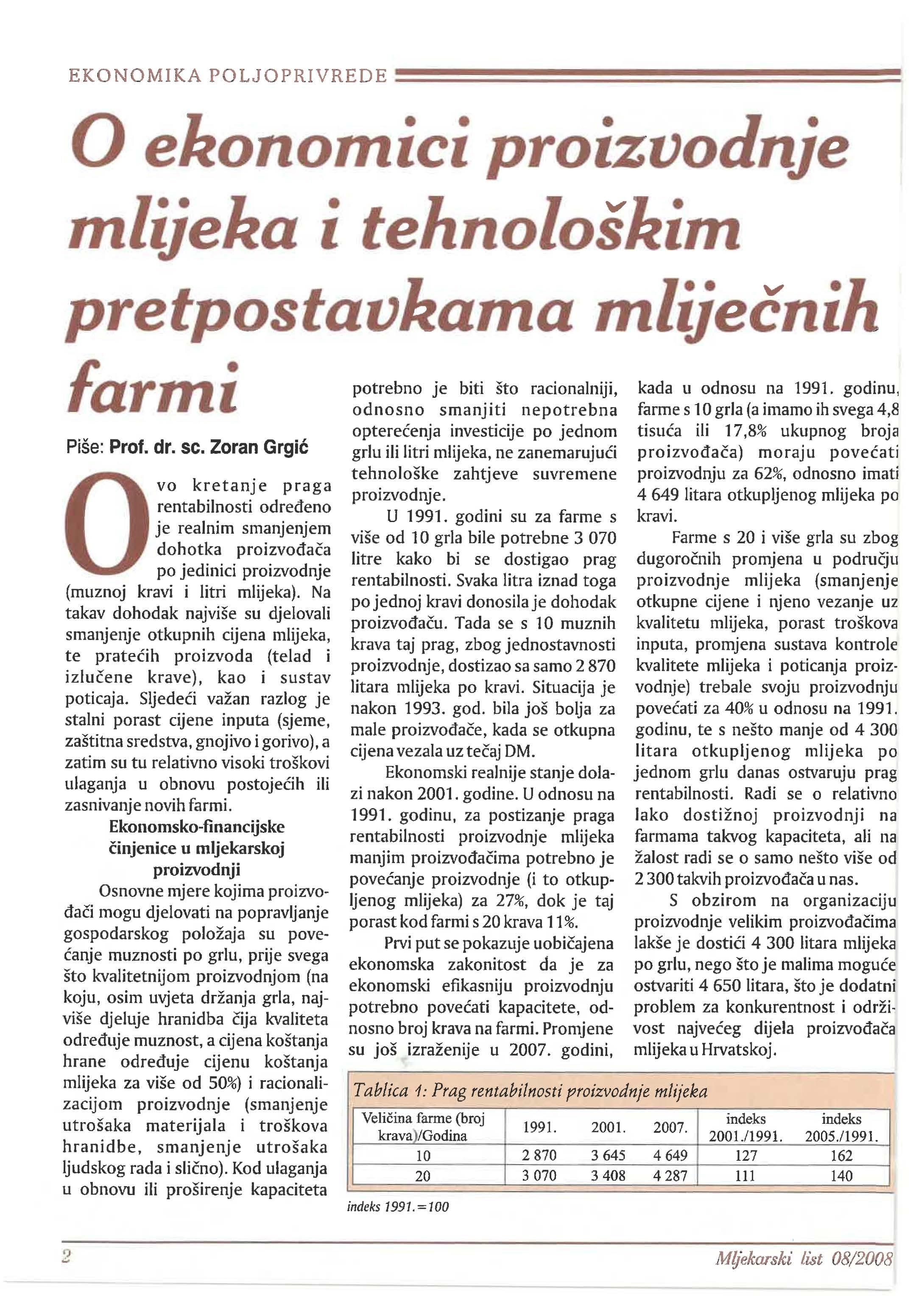 Ekonomski realnije stanje dolazi nakon 2001. godine. U odnosu na 1991. godinu, za postizanje praga rentabilnosti proizvodnje mlijeka manjim potrebno je proizvodnje (i to otkupIjenog mlijeka) za 27%, dok je taj porast kod farmi s 20 krava 11%.