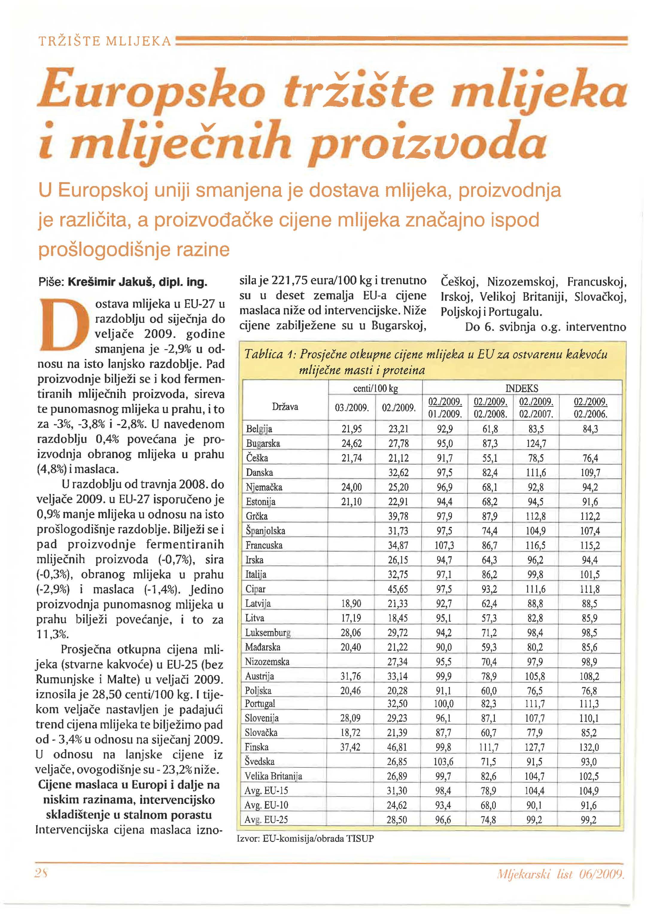 Na temelju dogovora sa sastanka održanog 20. ožujka 2009. godine u Ministarstvu poljoprivrede, ribarstva i ruralnog razvoja, predstavnika mlijeka i mljekarske industrije, Hrvatska poljoprivredna agencija ukupnu cijenu mlijeka za promatrana razdoblje, a cijena mlijeka predstavlja cijenu koja je formirana na temelju sadržaja masti od 4,2% i