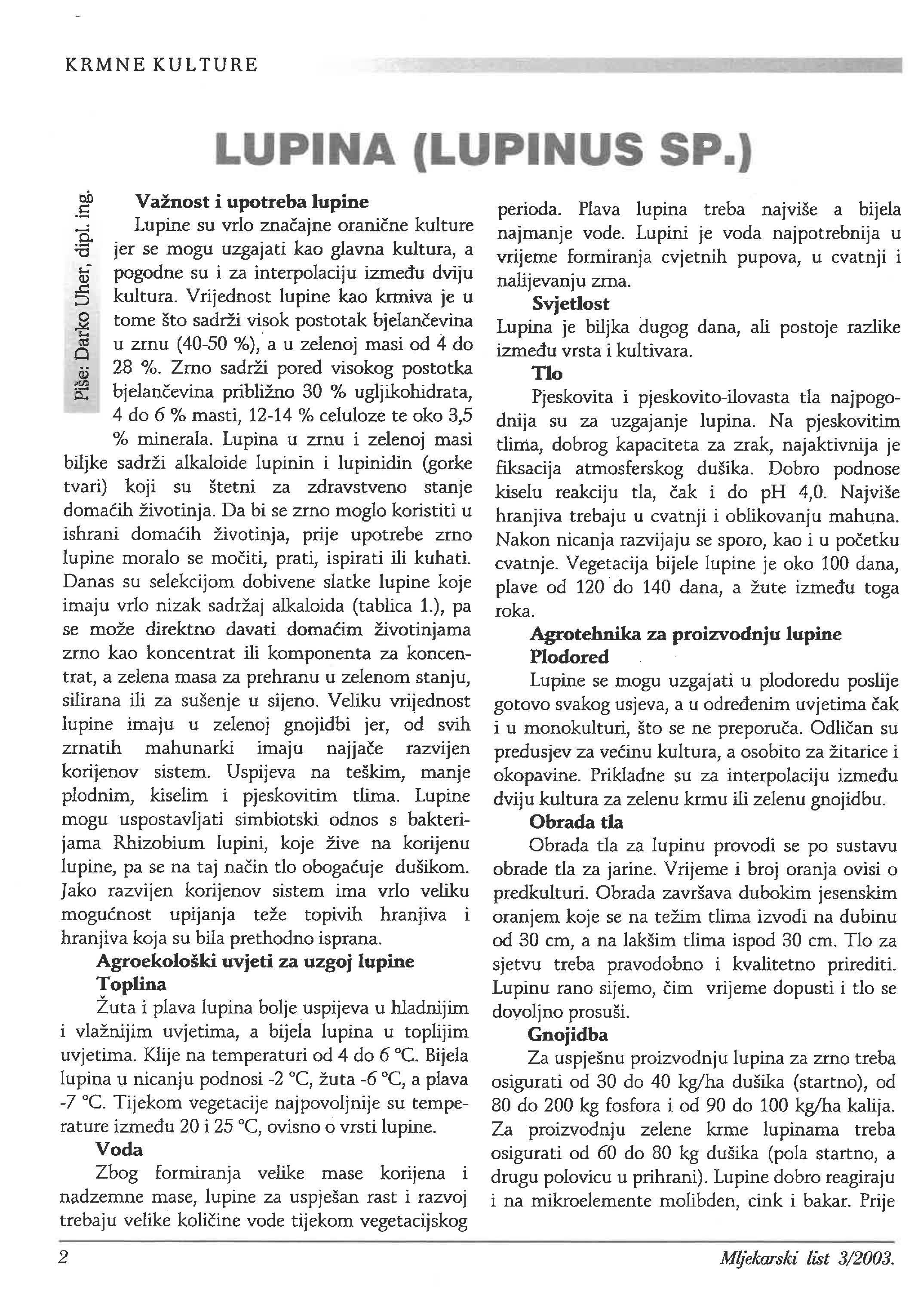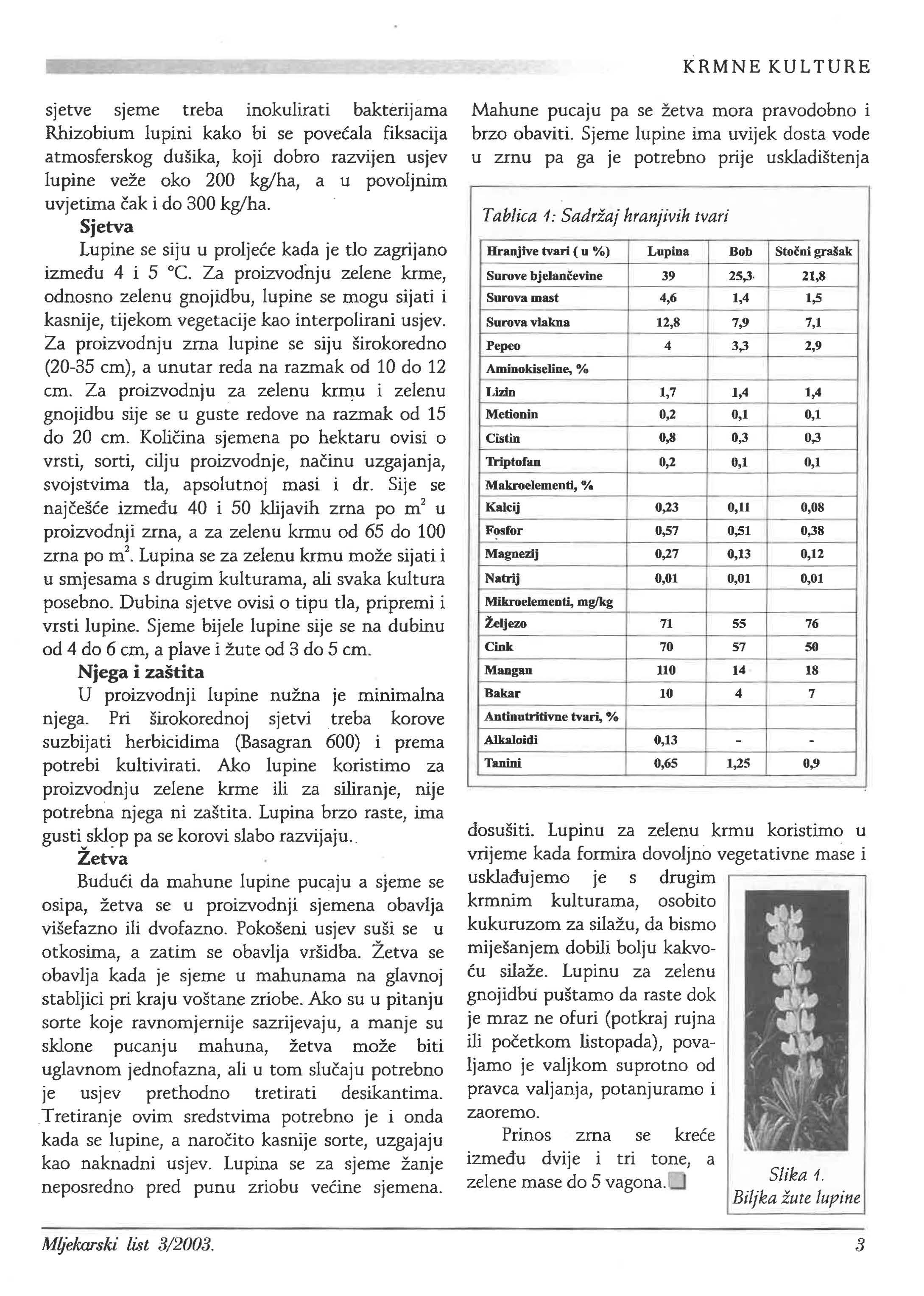 Lupine su vrlo kulture :& -o jer se mogu uzgajati kao glavna kultura, a pogodne su i za interpolaciju dviju kultura. Vrijednost lupine kao krmiva je u .§ tome što sadrži visok postotak t::3 u zrnu (40-50 %),·a u zelenoj masi od 4 do j 28 %. Zrno sadrži pored visokog postotka l5::: približno 30 % ugljikohidrata, 4 do 6 % masti, 12-14 % celuloze te oko 3,5 % minerala. Lupina u zrnu i zelenoj masi biljke sadrži alkaloide lupinin i lupinidin (gorke tvari) koji su štetni za zdravstveno stanje životinja. Da bi se zrno moglo koristiti u ishrani životinja, prije upotrebe zrno lupine morala se prati, ispirati ili kuhati. Danas su selekcijom dobivene slatke lupine koje imaju vrlo nizak sadržaj alkaloida (tablica 1.), pa se može direktno davati životinjama zrno kao koncentrat ili komponenta za koncentrat, a zelena masa za prehranu u zelenom stanju, silirana ili za sušenje u sijeno. Veliku vrijednost lupine imaju u zelenoj gnojidbi jer, od svih zrnatih mahunarki imaju na11ace razvijen korijenov sistem. Uspijeva na teškim, manje plodnim, kiselim i pjeskovitim tlima. Lupine mogu uspostavljati simbiotski odnos s bakterijama Rhizobium lupini, koje žive na korijenu lupine, pa se na taj tlo dušikom. Jako razvijen korijenov sistem ima vrlo veliku upijanja teže topivih hranjiva i hranjiva koja su bila prethodno isprana.