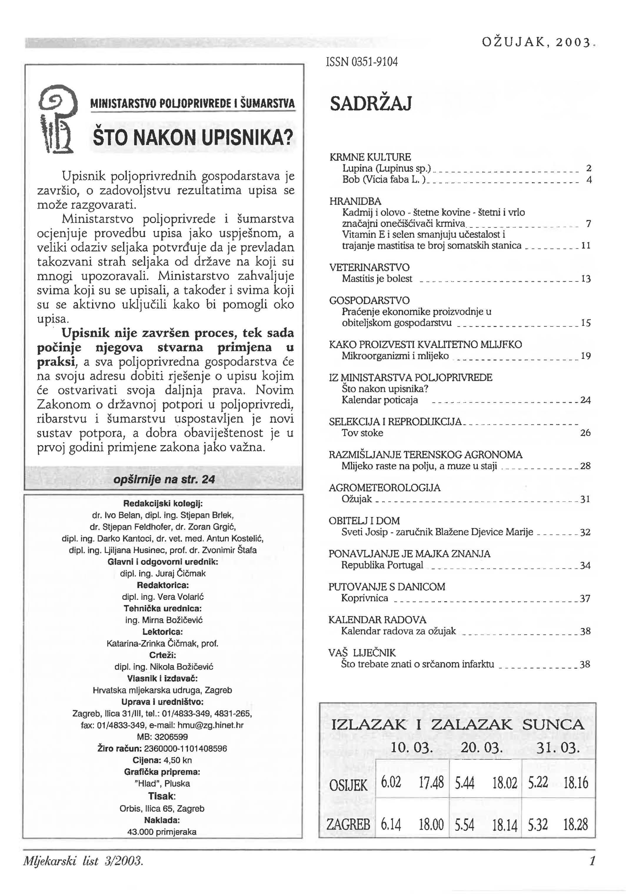 Glavni i odgovorni urednik: dipl. ing. Juraj Redaktorica: dipl. ing. Vera urednica: ing. Mirna Lektorica: Katarina-Zrinka prof. Crteži: dipl. ing. Nikola Vlasnik i Hrvatska mljekarska udruga, Zagreb Uprava I uredništvo: Zagreb, llica 31/111,tel.: 01/4833-349, 4831-265, fax: 01/4833-349, e-mail: hmu@zg.hinet.hr