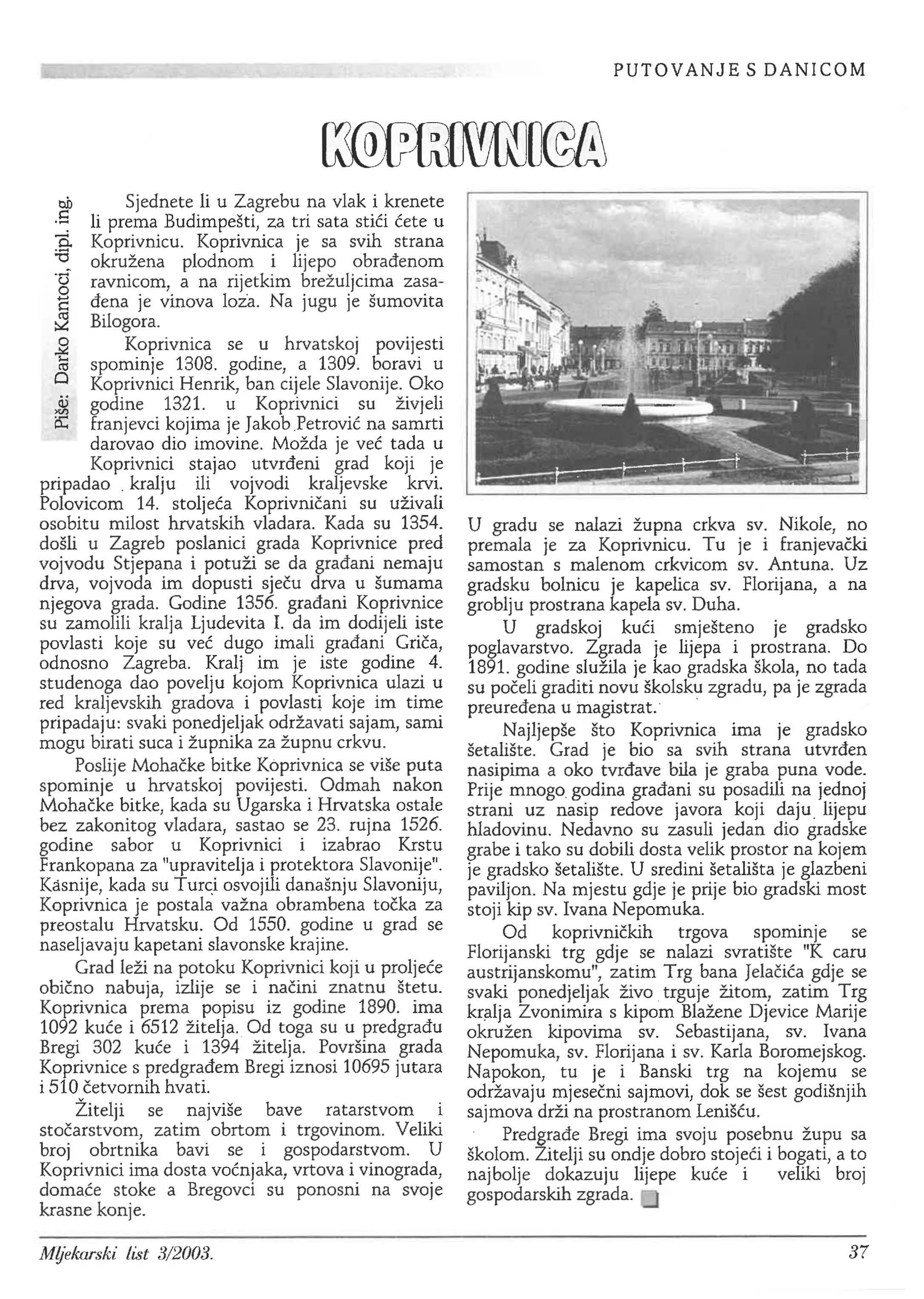 ci, Sjednete li u Zagrebu na vlak i krenete .S li prema Budimpešti, za tri sata u :g. Koprivnicu. Koprivnica je sa svih strana -o okružena plodnom i lijepo ·u ravnicom, a na rijetkim brežuljcima zasa§ je vinova loza. Na jugu je šumovita Bilogora .§ Koprivnica se u hrvatskoj povij~sti co spominje 1308. godine, a 1309. boravi u Cl Koprivnici Henrik, ban cijele Slavonije. Oko j godine 1321. u Koprivnici su živjeli ii: franjevci kojima je Jakob na samrti darovao dio imovine. Možda je tada u Koprivnici stajao grad koji j~ pripadao . kralju i~i , vojvod~ ~alj_evske ~~rvi: Polovicom 14. stol1eca Kopnvmcam su uzivah osobitu milost hrvatskih vladara. Kada su 1354. došli u Zagreb poslanici grada Koprivnice pred vojvodu Stjepana i potuži se da nemaju drva, vojvoda im dopusti drva u šumama njegova grada. Godine 1356. Kopriyr:ice su zamolili kralja Ljudevita I. da im dodi1eh iste povlasti koje su dugo imali odnosno Zagreba. Kralj im je iste godine 4. studenoga dao povelju kojom Koprivnica ulazi u red kraljevskih gradova i povlasti koje im time pripadaju: svaki ponedjeljak održavati sajam, sami mogu birati suca i župnika za župnu crkvu.