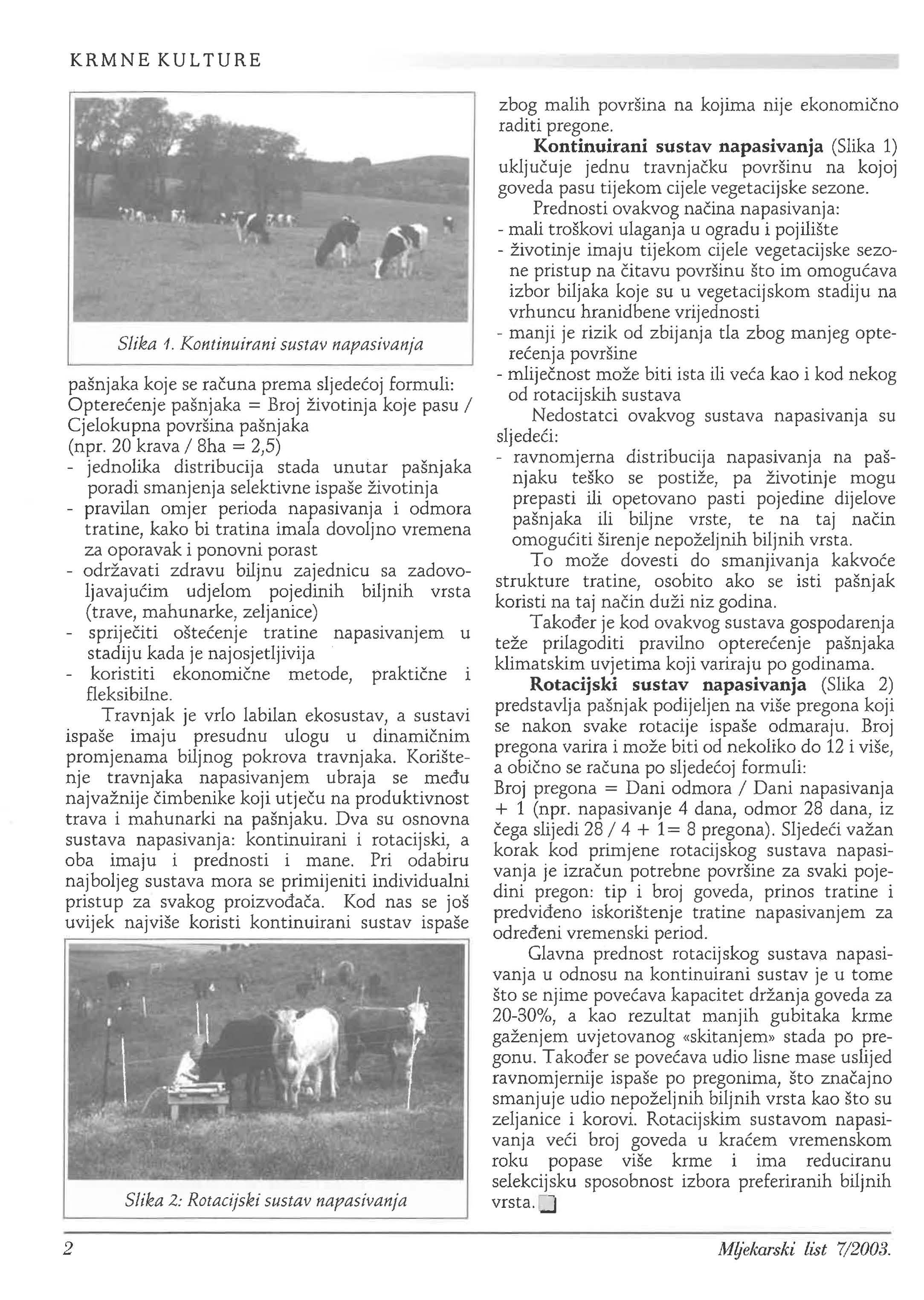 _ Glavna prednost rotacijskog sustava napasi~an1a u_?dnosu na kontinuirani sustav je u tome sto se n1ime kapacitet držanja goveda za 20:30~0, a k_ao rezultat manjih gubitaka krme gazen1em uv1etovanog «skitanjem» stada po pregonu. T ~ko~er _se udio lisne mase uslijed ravnonl:Jerniie 1spase po pregonima, što sman1u1e udio nepoželjnih biljnih vrsta kao što su zelj~nice ,i. kor~vi. Rotacijskim sustavom napasivan1a veci broj goveda u vremenskom roku popase više krme i ima reduciranu selekcij~ku sposobnost izbora preferiranih biljnih vrsta. U