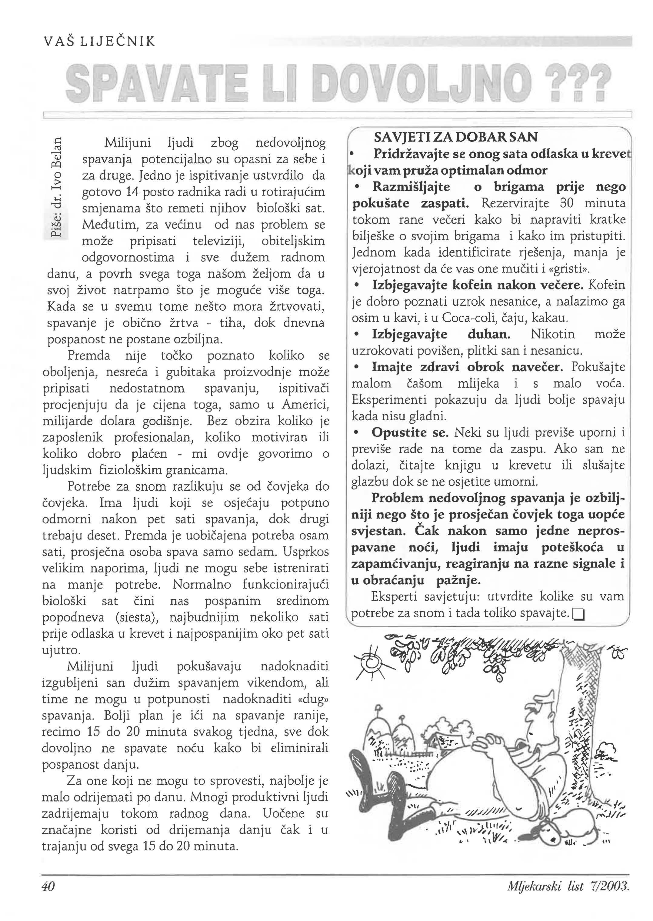 li; Milijuni ljudi zbog nedovoljnog spavanja potencijalno su opasni za sebe i i za druge. Jedno je ispitivanje ustvrdilo da ...; gotovo 14 posto radnika radi u smjenama što remeti njihov biološki sat. za od nas problem se može pripisati televiziji, obiteljskim odgovornostima i sve dužem radnom danu, a povrh svega toga našom željom da u svoj život natrpamo što je više toga. Kada se u svemu tome nešto mora žrtvovati 1 spavanje je žrtva - tiha, dok dnevna pospanost ne postane ozbiljna.