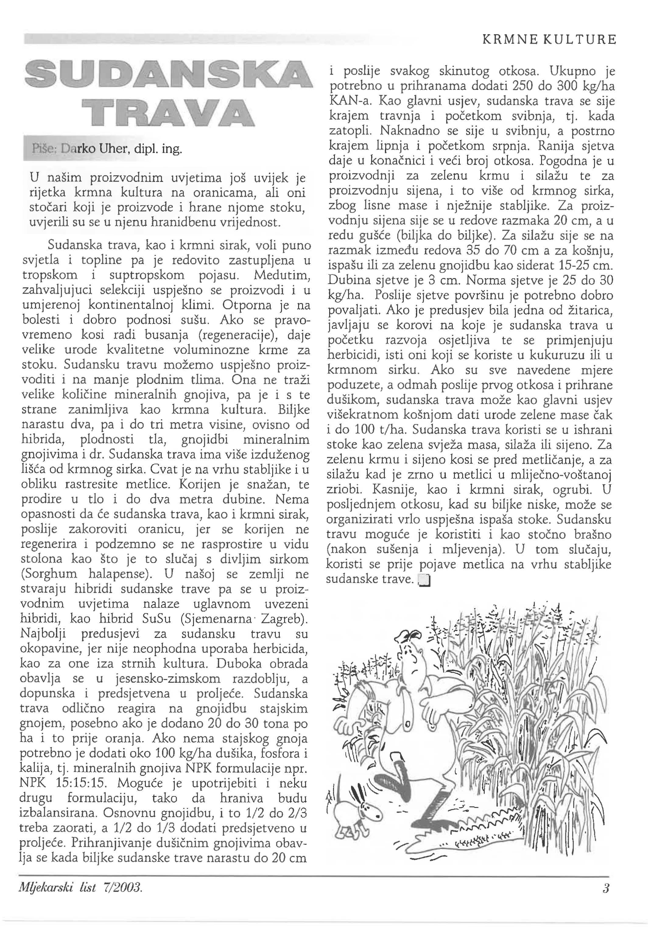 i poslije svakog skinutog otkosa. Ukupno je potrebno u prihranama dodati 250 do 300 kg/ha KAN-a. Kao glavni usjev, sudanska trava se sije krajem travnja i svibnja, tj. kada zatopli. Naknadno se sije u svibnju, a postrna krajem lipnja i srpnja. Ranija sjetva daje u i broj otkosa. Pogodna je u proizvodnji za zelenu krmu i silažu te za proizvodnju sijena, i to više od krmnog sirka, zbog lisne mase i nježnije stabljike. Za proizvodnju sijena sije se u redove razmaka 20 cm, a u redu (biljka do biljke). Za silažu sije se na razmak redova 35 do 70 cm a za košnju, ispašu ili za zelenu gnojidbu kao siderat 15-25 cm. Dubina sjetve je 3 cm. Norma sjetve je 25 do 30 kg/ha. Poslije sjetve površinu je potrebno dobro povaljati. Ako je predusjev bila jedna od žitarica, javljaju se korovi na koje je sudanska trava u razvoja osjetljiva te se primjenjuju herbicidi, isti oni koji se koriste u kukuruzu ili u krmnom sirku. Ako su sve navedene mjere poduzete, a odmah poslije prvog otkosa i prihrane dušikom, sudanska trava može kao glavni usjev višekratnom košnjom dati urode zelene mase i do 100 t/ha. Sudanska trava koristi se u ishrani stoke kao zelena svježa masa, silaža ili sijeno. Za zelenu krmu i sijeno kosi se pred a za silažu kad je zrno u metlici u zriobi. Kasnije, kao i krmni sirak, ogrubi. U posljednjem otkosu, kad su biljke niske, može se organizirati vrlo uspješna ispaša stoke. Sudansku travu je koristiti i kao brašno (nakon sušenja i mljevenja). U tom koristi se prije pojave metlica na vrhu stabljike sudanske trave ..J