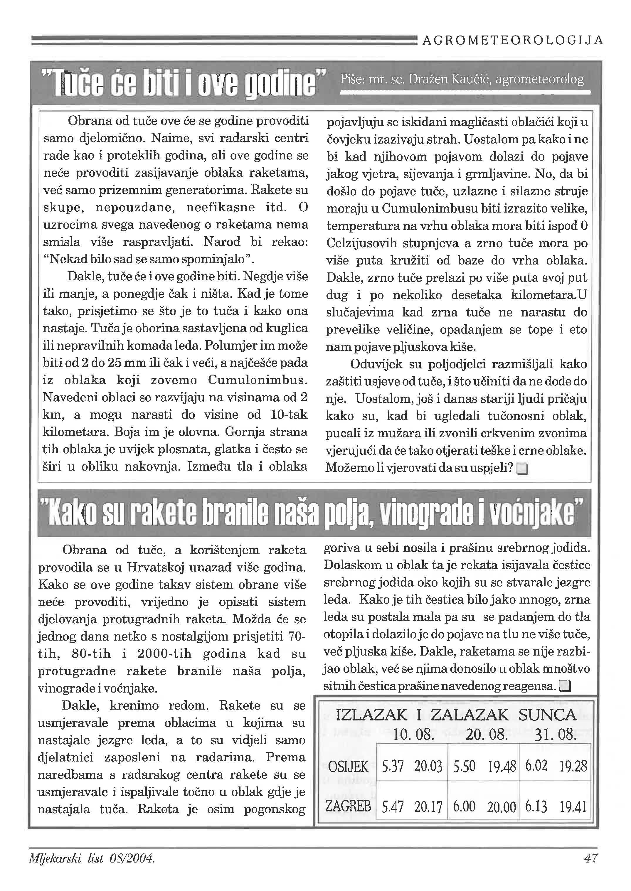 Obrana od ove se godine provoditi samo Naime, svi radarski centri rade kao i proteklih godina, ali ove godine se provoditi zasijavanje oblaka raketama, samo prizemnim generatorima. Rakete su skupe, nepouzdane, neefikasne itd. O uzrocima svega navedenog o raketama nema smisla više raspravljati. Narod bi rekao: "Nekad bilo sad se samo spominjalo".