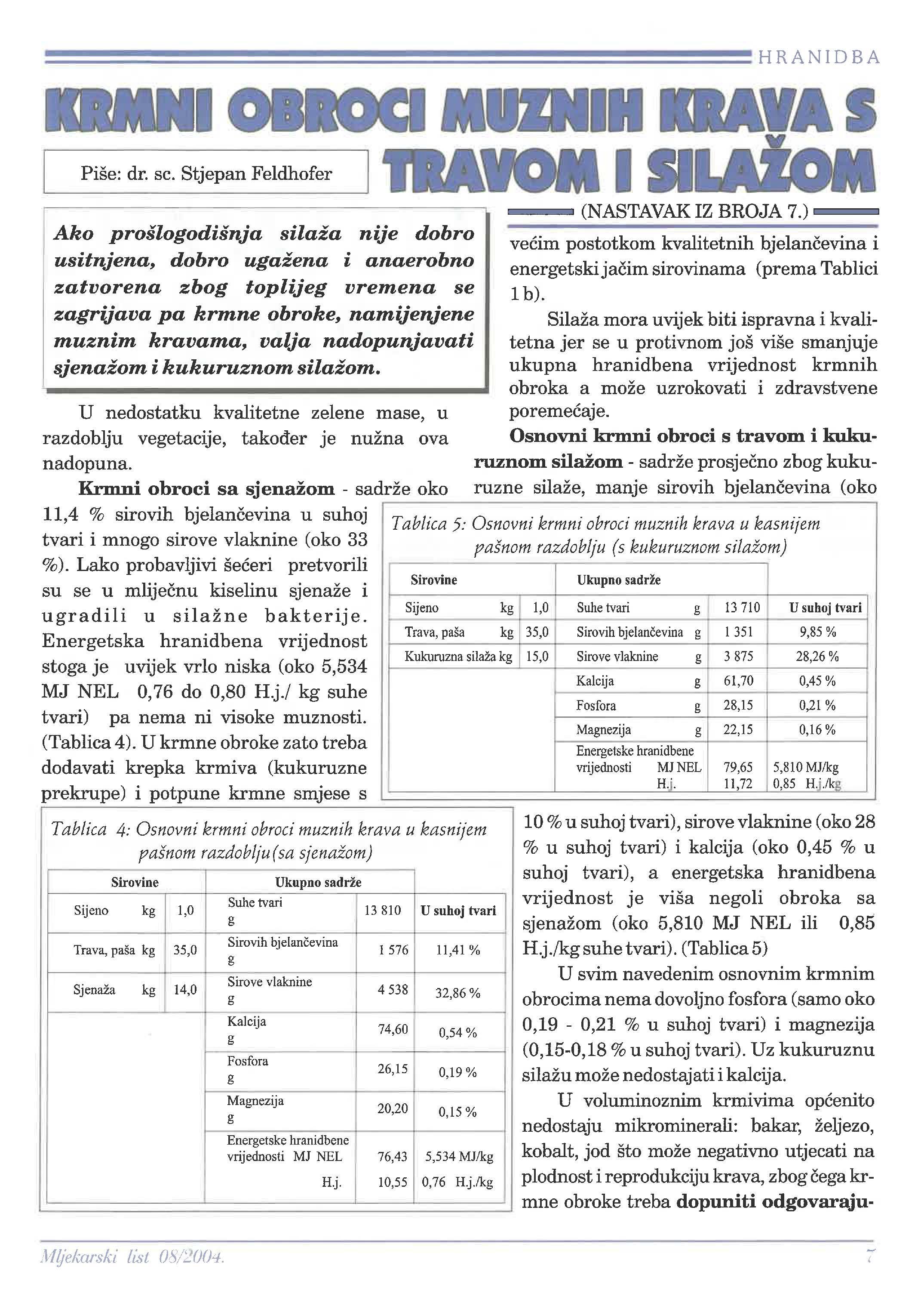 Osnovni krmni obroci s travom i kukuruznom silažom - sadrže zbog kukuruzne silaže, manje sirovih (oko 11,4 % sirovih u suhoj tvari i mnogo sirove vlaknine (oko 33 %). Lako probavljivi pretvorili su se u kiselinu sjenaže i ugradili u silažne bakterije. Energetska hranidbena vrijednost stoga je uvijek vrlo niska (oko 5,534 MJ NEL O,76 do 0,80 H.j./ kg suhe tvari) pa nema ni visoke muznosti. (Tablica 4). U krmne obroke zato treba dodavati krepka krmiva (kukuruzne prekrupe) i potpune krmne smjese s