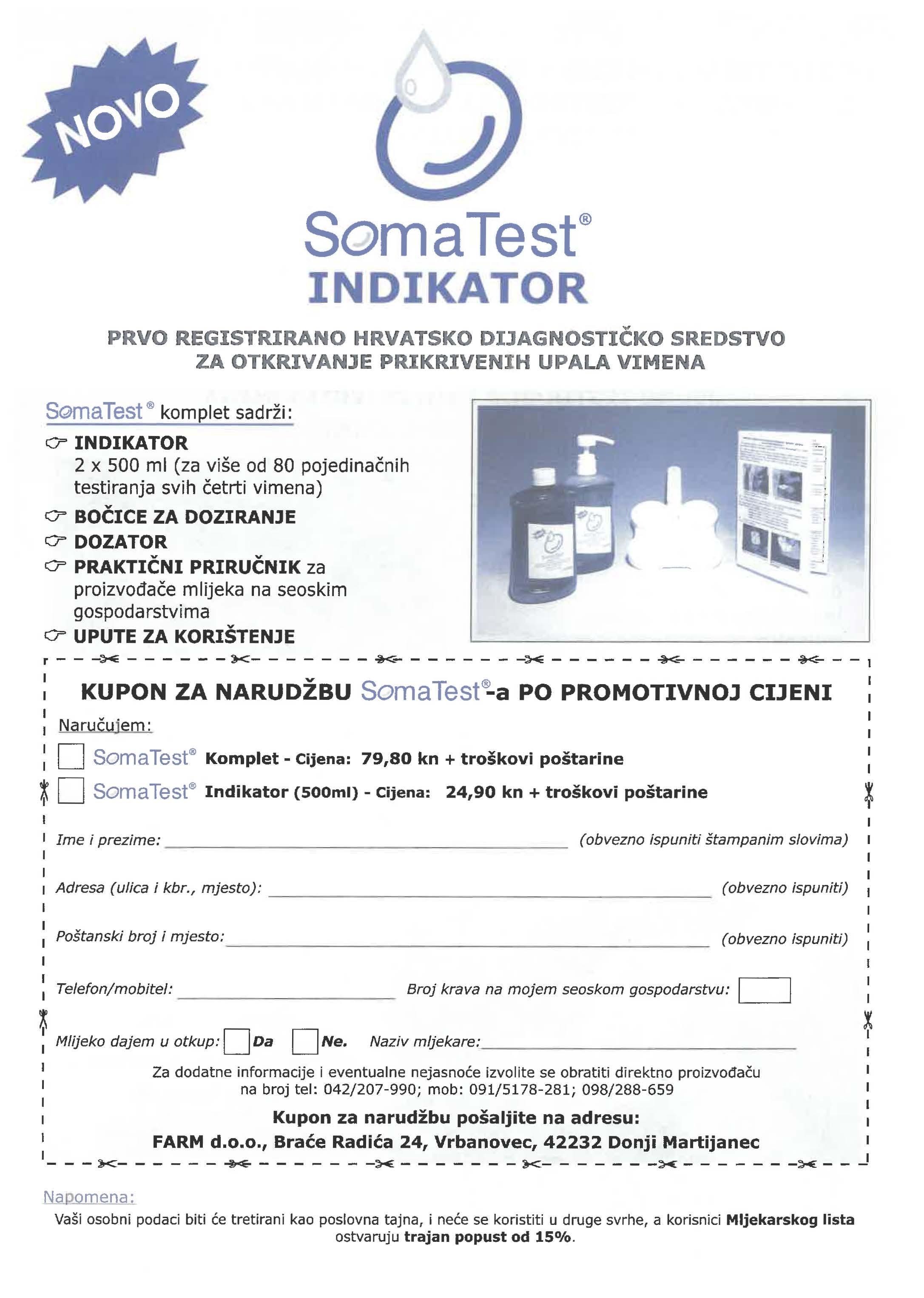 I V 1 Narucujem: : D Soma Test® Komplet - Cijena: 79,80 kn+ troškovi poštarine t D Soma Test® Indikator (500ml) - Cijena: 24,90 kn+ troškovi poštarine ; Ime i prezime: _________________ _ (obvezno ispuniti štampanim slovima)