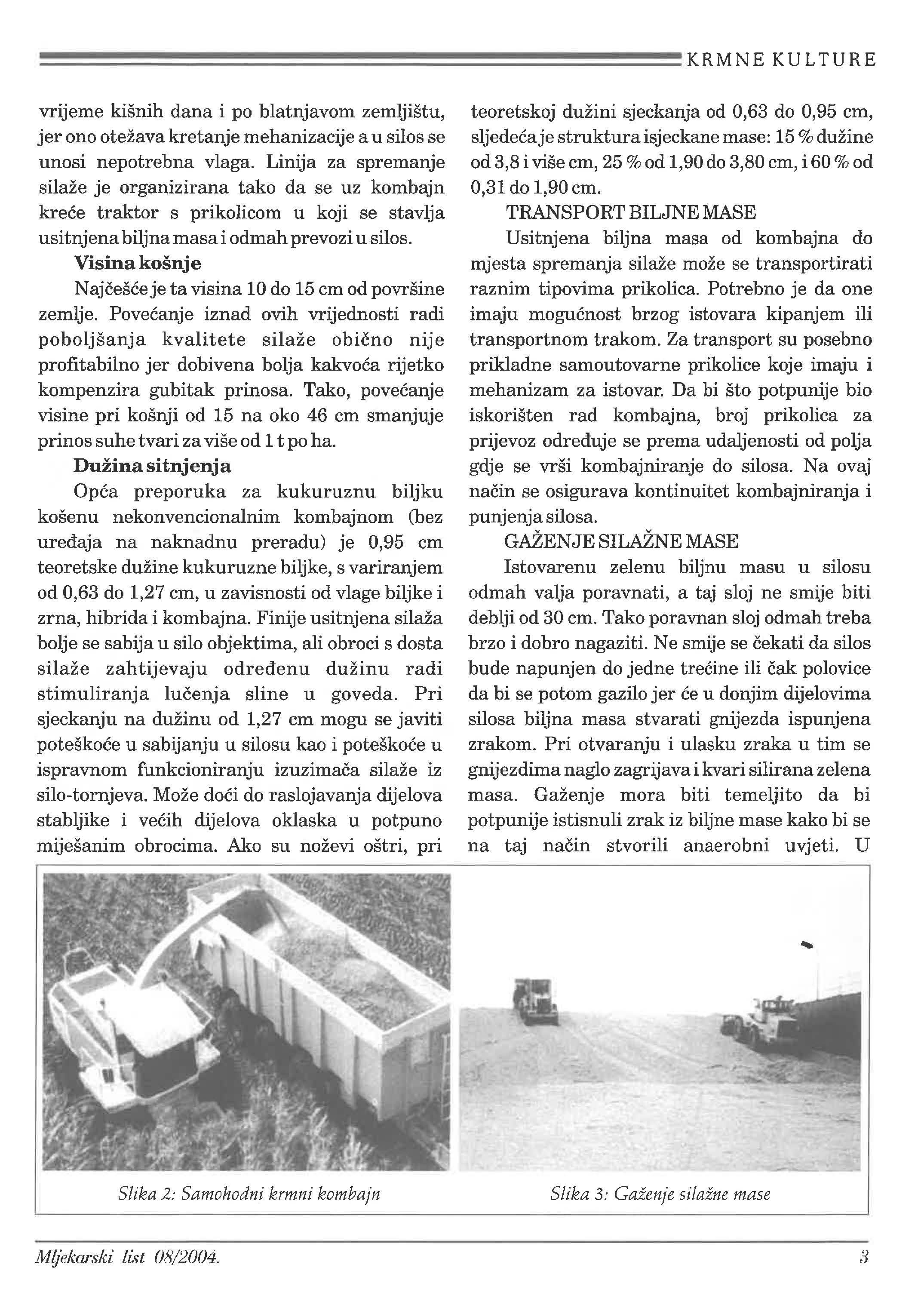 vrijeme kišnih dana i po blatnjavom zemljištu, jer ono otežava kretanje mehanizacije a u silos se unosi nepotrebna vlaga. Linija za spremanje silaže je organizirana tako da se uz kombajn traktor s prikolicom u koji se stavlja usitnjena biljna masa i odmah prevozi u silos.