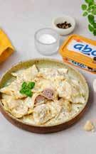 Za to vrijeme zagrijte vrhnje i ABC sir te začinite po ukusu. Dodajte oko 50 ml vode od kuhanja raviola (ili po potrebi) pa prebacite raviole u umak. Zagrijte sve zajedno 2–3 minute, pospite parmezanom i svježe mljevenim paprom i poslužite odmah. Dobar tek!