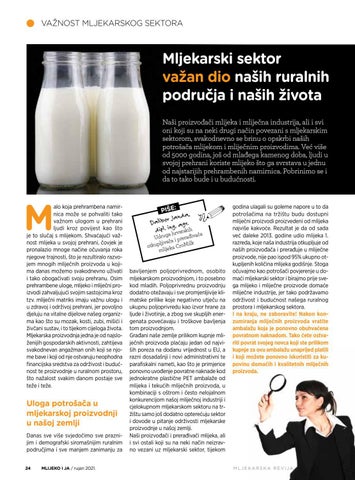alo koja prehrambena namirnica može se pohvaliti tako važnom ulogom u prehrani ljudi kroz povijest kao što je to slučaj s mlijekom. Shvaćajući važnost mlijeka u svojoj prehrani, čovjek je pronalazio mnoge načine očuvanja roka njegove trajnosti, što je rezultiralo razvojem mnogih mliječnih proizvoda u kojima danas možemo svakodnevno uživati i tako obogaćivati svoju prehranu. Osim prehrambene uloge, mlijeko i mliječni proizvodi zahvaljujući svojim sastojcima kroz tzv. mliječni matriks imaju važnu ulogu i u zdravoj i održivoj prehrani, jer povoljno djeluju na vitalne dijelove našeg organizma kao što su mozak, kosti, zubi, mišići i živčani sustav, i to tijekom cijeloga života. Mljekarska proizvodnja jedna je od najsloženijih gospodarskih aktivnosti, zahtijeva svakodnevan angažman onih koji se njome bave i koji od nje ostvaruju neophodna financijska sredstva za održivost i budućnost te proizvodnje u ruralnom prostoru, što nažalost svakim danom postaje sve teže i teže.