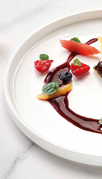 Prije posluživanja ogulite 1 naranču i crveni grejp i pripremite kriške i bobice. Na tanjur stavite coulis, dodajte krišku tarta i sve ukrasite bobicama i kriškama agruma. Ukrasite listićima metvice.