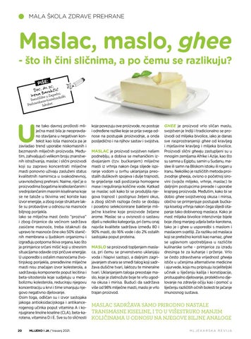 ne tako davnoj prošlosti mliječna mast bila je neopravdano stavljana u negativan kontekst kao loša masnoća pa je zavladao trend uporabe niskomasnih i bezmasnih mliječnih proizvoda. Međutim, zahvaljujući velikom broju znanstvenih istraživanja, maslac i slični proizvodi koji su zapravo koncentrati mliječne masti ponovno uživaju zasluženi status kvalitetnih namirnica u svakodnevnoj, uravnoteženoj prehrani. Naime, riječ je o proizvodima bogatima kratkolančanim i srednjolančanim masnim kiselinama koje se ne talože u tkivima već koriste kao izvor energije, a zbog svoje strukture lakše su probavljive u odnosu na masnoće biljnog porijekla. Iako se mliječna mast često “proziva” i zbog činjenice da većinom sadržava zasićene masnoće, treba istaknuti da upravo te masnoće čine oko 50% staničnih membrana u ljudskom organizmu i izgrađuju potporna tkiva organa, kao što je primjerice srčani mišić koji u stresnim situacijama odavde crpi pričuve energije. U usporedbi s ostalim masnoćama životinjskog porijekla, prerađevine mliječne masti nisu značajan izvor kolesterola, a sadržavaju komponente poput lecitina i beta-sitosterola koje sudjeluju u metabolizmu kolesterola, reduciraju njegovu koncentraciju u krvi i time smanjuju njegovo negativno djelovanje. Osim toga, odličan su i izvor sastojaka jakoga antioksidacijskoga i antikancerogenog učinka poput vitamina A i konjugirane linolne kiseline (CLA), beta-karotena, vitamina D i E. Sve su to sličnosti