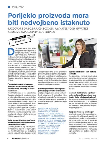r. sc. Darja Sokolić nova je ravnateljica Hrvatske agencije za poljoprivredu i hranu - HAPIH-a. Diplomirala je na Prehrambeno-tehnološkom fakultetu u Osijeku, a od 2008. zaposlena je u Hrvatskoj agenciji za hranu - HAH-u, čija je bila zadnja ravnateljica do spajanja s ostalim agencijama u Hrvatsku agenciju za poljoprivredu i hranu. Bila je voditeljica HAPIH-ova Centra za sigurnost hrane pa je izvrsno upoznata s proizvodnjom, kvalitetom, ali i kontrolom kvalitete hrane proizvedene u našoj državi. Od 2018. članica je Savjetodavnog vijeća Europske agencije za sigurnost hrane EFSA-e. Često slušamo kako je važna sljedivost u procesu proizvodnje, prerade i plasmana hrane. A HAPIH je tu veoma važan dionik. Republika Hrvatska je već prije ulaska u Europsku uniju ispunila sve obveze vezane uz zakonodavni dio osiguravanja sljedivosti hrane i ona se mora utvrđivati u svim fazama proizvodnje, prerade i distribucije hrane. Vezano za sustav sljedivosti, Hrvatska agencija za poljoprivredu i hranu (HAPIH) stoji iza oznake sljedivosti na proizvodu Hrana hrvatskih farmi i polja, a našim čitateljima svakako je najpoznatiji sustav označavanja mlijeka i mliječnih proizvoda “Mlijeko hrvatskih farmi”. Koji je osnovni cilj sustava označavanja mlijeka i mliječnih proizvoda oznakom “Mlijeko hrvatskih farmi”? Osnovna je zamisao tog sustava jasno i nedvosmisleno istaknuti podrijetlo, odnosno Republiku Hrvatsku kao područje na kojem je proizvod nastao. Europsko istraži-