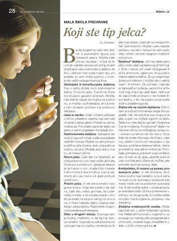 jete koje dolazi, osjećate se nesigurnim, čak i ljubomornim. Možda u jelu nalazite zamjenu i za seks i ljubav koji vam nedostaju. Iskren i otvoren razgovor može biti od pomoći. “Sjedeća” debljina. Još kao dijete vjerojatno niste voljeli sat tjelesnog (ili fizičkog) u školi. I danas još uvijek izbjegavate fizičke aktivnosti, uglavnom zbog prekomjerne tjelesne težine. Zbog svega toga živite pod stresom i možda ste u velikoj mjeri i frustrirani. Za početak, najbolja je tjelovježba hodanje, aerobička aktivnost koja uključuje cijelo tijelo. Važno je da započnete postupno i da hodate triput tjedno, s tim da polako povećavate dužinu prijeđenog puta. Stalno ste na raznim dijetama. Dobro vam je poznat broj kalorija svega što pojedete. Već ste isprobali sve moguće dijete, a ipak ne možete izgubiti na težini. Želite brz i trenutačan gubitak kilograma. Sve te moderne, “čudotvorne” dijete i reklamirani trikovi za mršavljenje upravo su i stvoreni za takve kao što ste vi. Smatrate da znate više nego stručnjaci, usprkos vašem kroničnom neuspjehu u rješavanju problema tjelesne težine. Vama je potrebna specijalna motivacija. Pokušajte, primjerice, pripraviti svoje omiljeno jelo, skinite se do gola, sjednite pred zrcalo i počnite jesti. Užasnuti, možda ćete prihvatiti razuman pristup dijeti. Ambijetalan, ili vezano uz posao, prekomjerni jelac. Vi ste otvorena, društvena osoba koja nerijetko ruča ili večera izvan kuće animirajući poslovne partnere i često ste na poslovnim putovanjima. Ili ste možda radnik u smjenama pa je redoslijed vaših obroka poremećen u odnosu na druge ljude, ili možda radite okruženi hamburgerima, pizzama i sladoledima. Debljina sredovječnih osoba. Može započeti već u vašim tridesetim godinama. Metabolički procesi u organizmu usporavaju se i kalorije više ne izgarate tako učinkovito. Umjesto toga, skladištite ih u tijelu u obliku masnog tkiva.