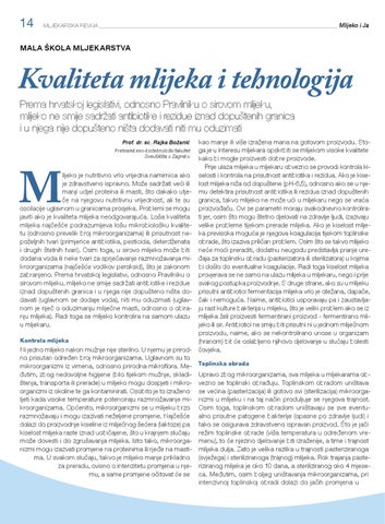 Kvaliteta mlijeka i tehnologija Prema hrvatskoj legislativi, odnosno Pravilniku o sirovom mlijeku, mlijeko ne smije sadržati antibiotike i rezidue iznad dopuštenih granica i u njega nije dopušteno ništa dodavati niti mu oduzimati Prof. dr. sc. Rajka Božanić