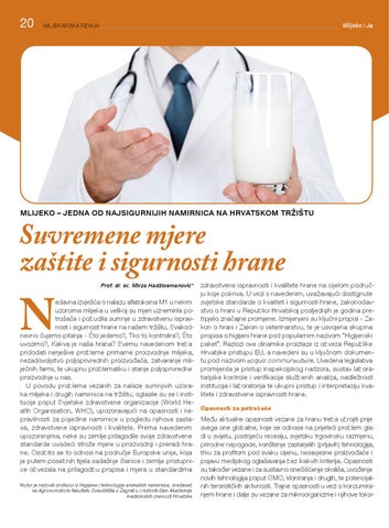 edavna izvješća o nalazu aflatoksina M1 u nekim uzorcima mlijeka u velikoj su mjeri uznemirila potrošače i pobudila sumnje u zdravstvenu ispravnost i sigurnost hrane na našem tržištu. Svakodnevno čujemo pitanja - Što jedemo?, Tko to kontrolira?, Što uvozimo?, Kakva je naša hrana? Svemu navedenom treba pridodati nerješive probleme primarne proizvodnje mlijeka, nezadovoljstvo poljoprivrednih proizvođača, zatvaranje mliječnih farmi, te ukupnu problematiku i stanje poljoprivredne proizvodnje u nas. U povodu problema vezanih za nalaze sumnjivih uzoraka mlijeka i drugih namirnica na tržištu, oglasile su se i institucije poput Svjetske zdravstvene organizacije (World Health Organisation, WHO), upozoravajući na opasnosti i nepravilnosti za pojedine namirnice u pogledu njihova sastava, zdravstvene ispravnosti i kvalitete. Prema navedenim upozorenjima, neke su zemlje prilagodile svoje zdravstvene standarde uvodeći strože mjere u proizvodnji i preradi hrane. Osobito se to odnosi na područje Europske unije, koja je putem posebnih tijela sadašnje članice i zemlje pristupnice obvezala na prilagodbu propisa i mjera u standardima