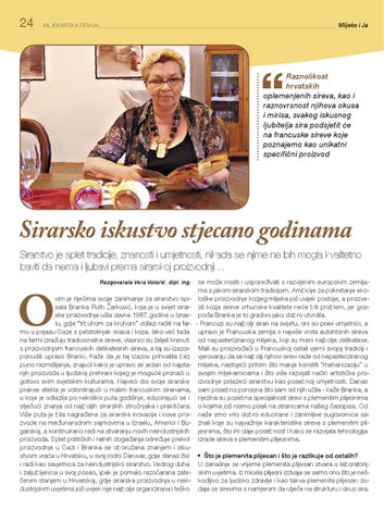 vim je riječima svoje zanimanje za sirarstvo opisala Branka Ruth Žarković, koja je u svijet sirarske proizvodnje ušla davne 1987. godine u Izraelu, gdje “trbuhom za kruhom” dolazi raditi na farmu u pojasu Gaze s petstotinjak ovaca i koza. Iako već tada na farmi izrađuju tradicionalne sireve, vlasnici su željeli krenuti s proizvodnjom francuskih delikatesnih sireva, a taj su izazov ponudili upravo Branki. Kaže da je taj izazov prihvatila bez puno razmišljanja, znajući kako je upravo sir jedan od najstarijih proizvoda u ljudskoj prehrani kojeg je moguće pronaći u gotovo svim svjetskim kulturama. Najveći dio svoje sirarske prakse stekla je volontirajući u malim francuskim siranama, u koje je odlazila po nekoliko puta godišnje, educirajući se i stječući znanja od najboljih sirarskih stručnjaka i praktičara. Više puta je bila nagrađena za sirarske inovacije i nove proizvode na međunarodnim sajmovima u Izraelu, Americi i Bugarskoj, a kontinuirano radi na stvaranju novih neindustrijskih proizvoda. Splet političkih i ratnih događanja određuje prekid proizvodnje u Gazi i Branka se oboružana znanjem i iskustvom vraća u Hrvatsku, u svoj rodni Daruvar, gdje danas živi i radi kao savjetnica za neindustrijsko sirarstvo. Vedrog duha i zaljubljenica u svoj posao, ipak je pomalo razočarana zatečenim stanjem u Hrvatskoj, gdje sirarska proizvodnja u neindustrijskim uvjetima još uvijek nije najbolje organizirana i teško