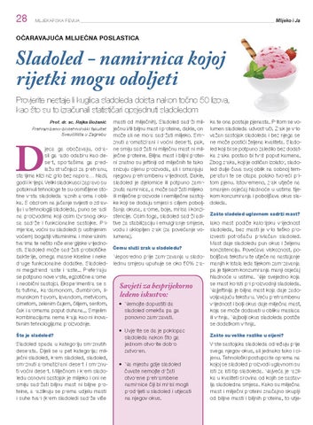 jeca ga obožavaju, odrasli ga rado odabiru kao desert, sportašima ga predlažu stručnjaci za prehranu, starijima klizi niz grlo bez napora… hladi, godi i krijepi. Veliki sladokusci zapravo su potaknuli tehnologe te su osmišljene stotine vrsta sladoleda raznih aroma i oblika. S obzirom na jačanje svijesti o zdravlju i u tehnologiji sladoleda, puno se radi na proizvodima koji osim izvrsnog okusa sadrže i funkcionalne sastojke. Primjerice, voćni su sladoledi (s usitnjenim voćem) bogatiji vitaminima i mineralnim tvarima te nešto niže energijske vrijednosti. Sladoled može sadržati probiotičke Čemu služi zrak u sladoledu? bakterije, omega masne kiseline i neke Neposredno prije zamrzavanja u sladodruge funkcionalne dodatke. Sladoled- lednu smjesu upuhuje se oko 50% zrani megatrend raste i raste... Preferiraju se potpuno nove vrste, egzotične arome i neobični sastojci. Eksperimentira se s Savjeti za besprijekorno tartufima, kardamonom, đumbirom, liledeno iskustvo: munskom travom, lavandom, metvicom, cimetom, zelenim čajem, čilijem, senfom, • Nemojte dopustiti da čak i aromama poput duhana... Smjelim sladoled omekša pa ga kombinacijama nema kraja kao ni inovaponovno zamrzavati. tivnim tehnologijama proizvodnje. • Uvjerite se da je poklopac Što je sladoled? sladoleda nakon što ga jednom otvorite dobro Sladoled spada u kategoriju smrznutih zatvoren. deserata. Dijeli se u pet kategorija: mliječni sladoled, krem sladoled, sladoled, • Na mjestu gdje sladoled smrznuti aromatizirani desert i smrznučuvate nemojte držati ti voćni desert. Mliječnom i krem sladootvorene prehrambene ledu osnovni sastojak je mlijeko i oni ne namirnice čiji bi mirisi mogli smiju sadržati biljnu mast ni biljne proprodrijeti u sladoled i utjecati teine, a razlikuju se prema udjelu masti na njegov okus. i suhe tvari (krem sladoledi sadrže više