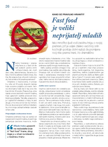 ba upozoriti na nedostatke takve hrane, zbog čega ju u stvari svrstavamo u nezdravu hranu. Koja je to hrana i koja su to pića? Riječ je o različitim chipi-chips proizvodima, hamburgerima, hot dogovima, slatkišima, slatkim bezalkoholnim gaziranim pićima itd. Zašto je štetno jesti takvu hranu? U prvom redu sadrži velike količine zasićenih masnoća. Zatim, brza hrana često sadrži i previše soli, a mi ju još i dodatno solimo. Dakako, prisutno je i puno šećera. Zna se, mast, sol i šećer veliki su neprijatelji našeg zdravlja, osobito zdravlja mladih. Razumljivo, treba istaknuti kako opasnosti nema ako se brza hrana uzima povremeno i u malim količinama, ali ona ne smije biti na jelovniku svakodnevno ili bez kritičnog odnosa prema pojedenim količinama. Treba voditi brigu da prehrana bude raznovrsna i uravnotežena. Neka sadrži manje masnoća a više ugljikohidrata, i uz to valja redovito provoditi tjelovježbu. Fizička neaktivnost igra veću ulogu u dobivanju na težini nego prehrana s puno kalorija. Razumljivo, u svakodnevnoj zdravoj prehrani uvijek postoji prostor da se u nju ugura i nešto što je manje zdravo, ali što volite. Nema problema, slobodno i to ubacite u svoj obrok, ali neka bude u maloj količini i ograničite druge izvore masnoća.