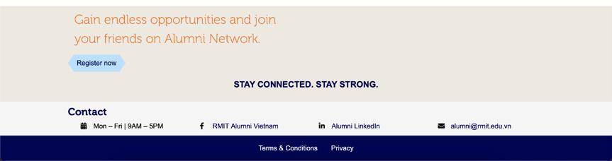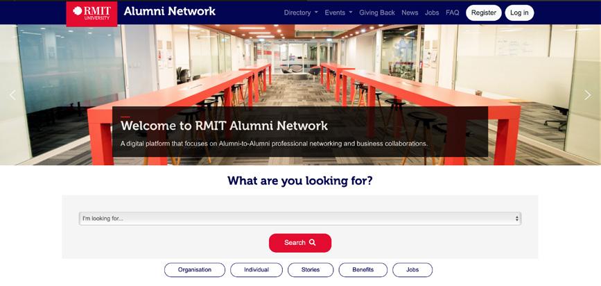 Được phát triển và ứng dụng từ tháng 3/2021, Mạng lưới cựu sinh viên RMIT (RMIT Alumni Network) là nền tảng chính thức cho cộng đồng cựu sinh viên, giúp các cựu sinh viên trò chuyện & kết nối với bạn học, đối tác tiềm năng, và người cố vấn trên toàn thế giới.