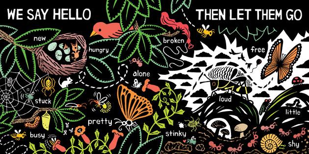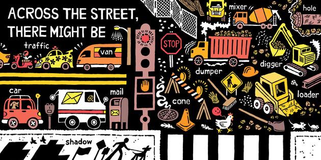 Spreads are thoughtfully organized to give readers time with different types of words. One spread is full of onomatopoeia. Another full of color words. Another still invites readers to think about scale—big things and small ones. The high–contrast art is married beautifully with lots of detail on each page, giving the youngest readers lots to find and a friendly environment in which to discover something new on every read.