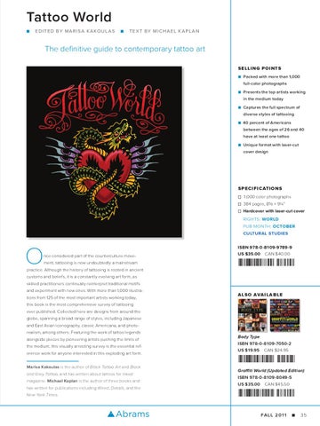 The definitive guide to contemporary tattoo art s e lling points ■ Packed with more than 1,000 full-color photographs ■ Presents the top artists working in the medium today ■ Captures the full spectrum of diverse styles of tattooing ■ 40 percent of Americans between the ages of 26 and 40 have at least one tattoo ■ Unique format with laser-cut cover design