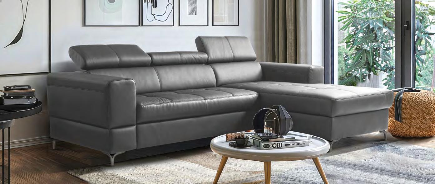 €4.056 Usnjena kotna sedežna garnitura TORINO, 247x173cm, leva ali desna postavitev, ležišče, predal, 3x nastavljiv vzglavnik, usnje/um.usnje MIX 511 temno siva