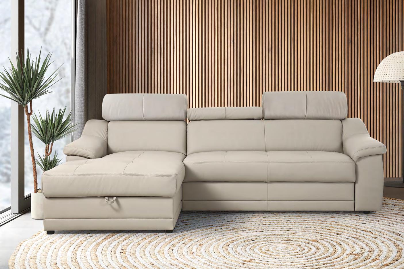 Usnjena kotna sedežna garnitura ALBA, 162x244cm, leva ali desna postavitev, ležišče, predal, 3x nastavljiv vzglavnik, usnje/um.usnje rjava, taupe, bela ali črna