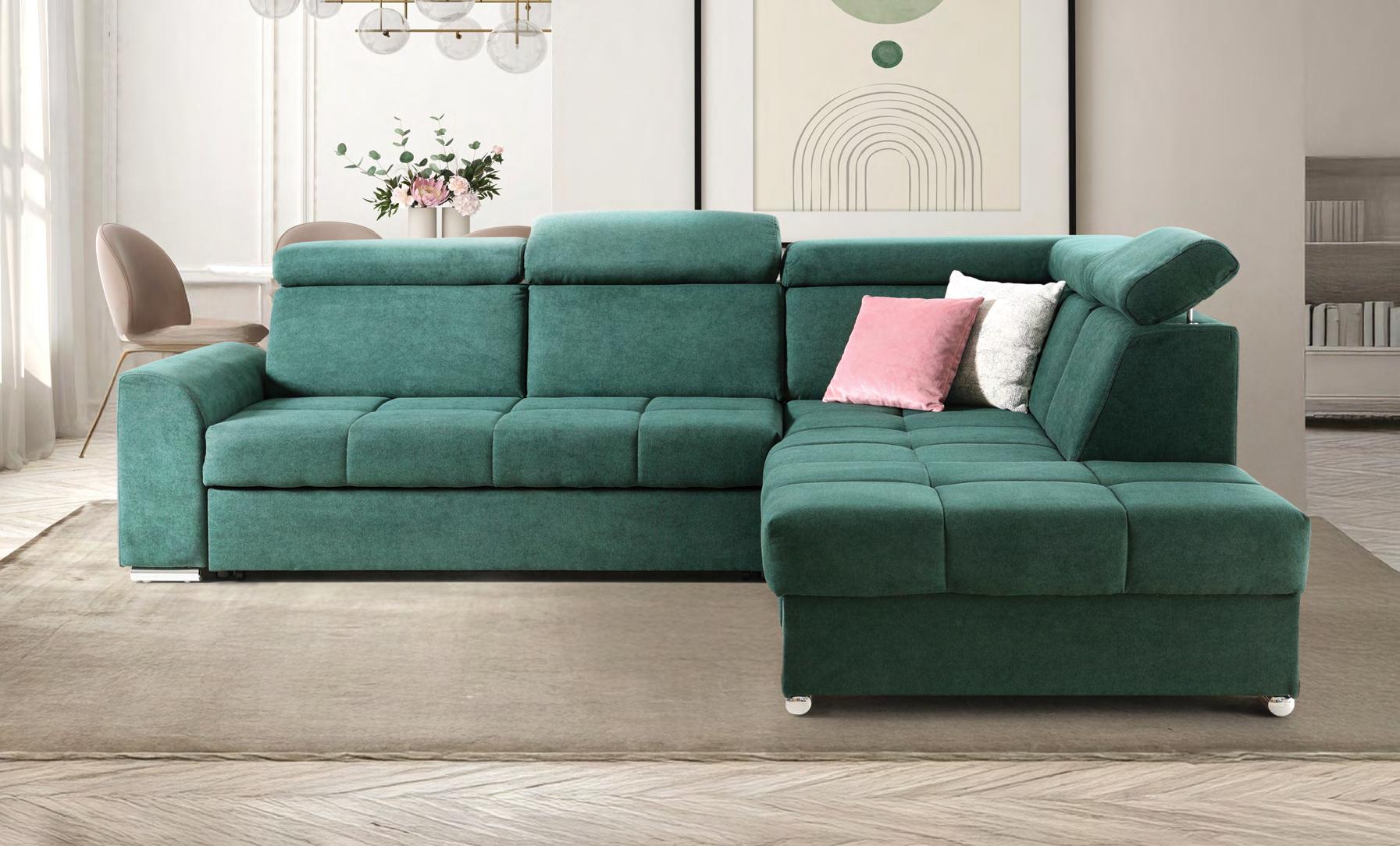 €1.590 Kotna sedežna BREVA, vzmeteno, 174x294cm, leva ali desna postavitev, ležišče, predal, 2x nastavljiv rokonaslon, blago ASTON srebrna, siva ali modra