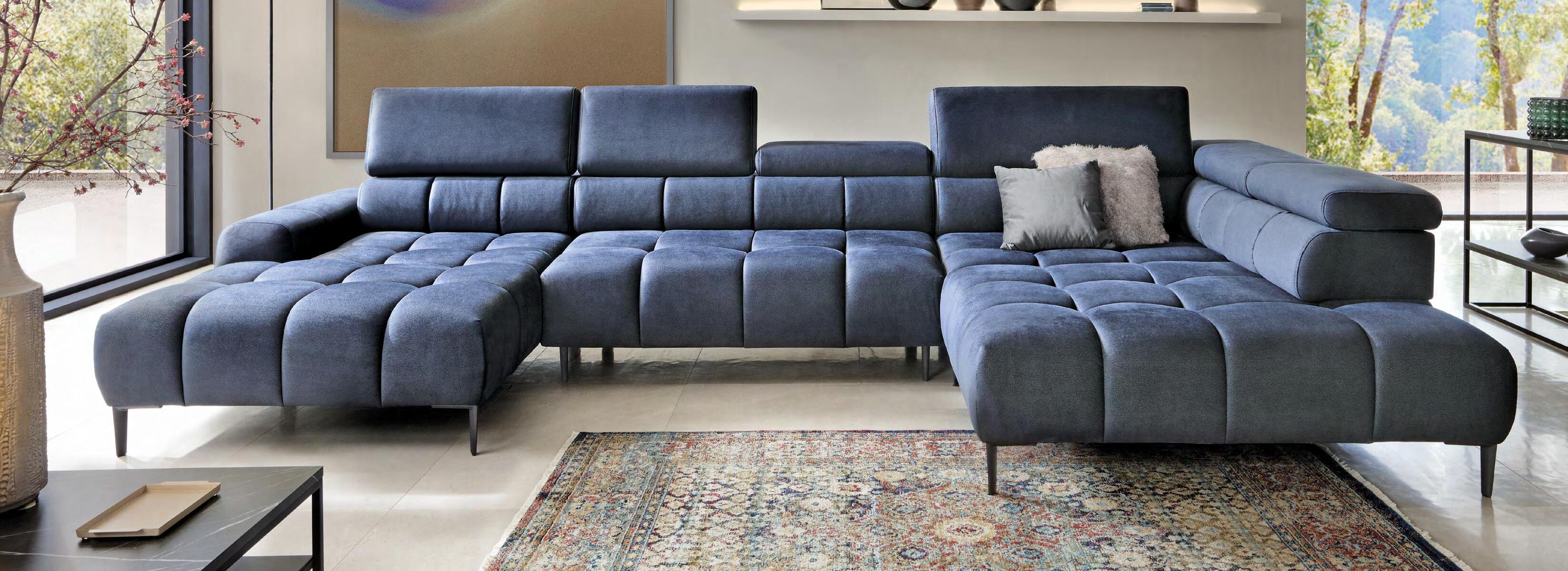 €3.590 Kotna sedežna garnitura PATTON XL, vzmeteno, 182x376x227cm, leva ali desna postavitev, električno pomično sedišče, 1x pomično hrbtišče, 6x nastavljiv vzglavnik, material SALVADOR različne barve iz zaloge