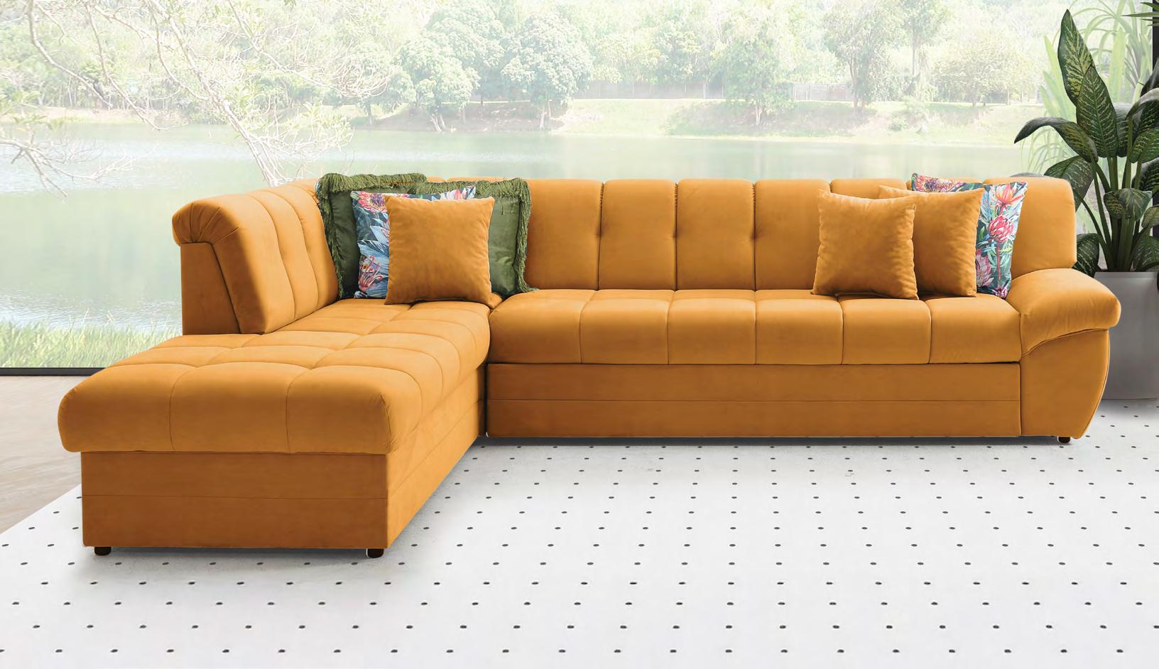 Kotna sedežna garnitura RELAX L, 235x305cm, leva ali desna postavitev, ležišče, različni materiali in barve iz zaloge