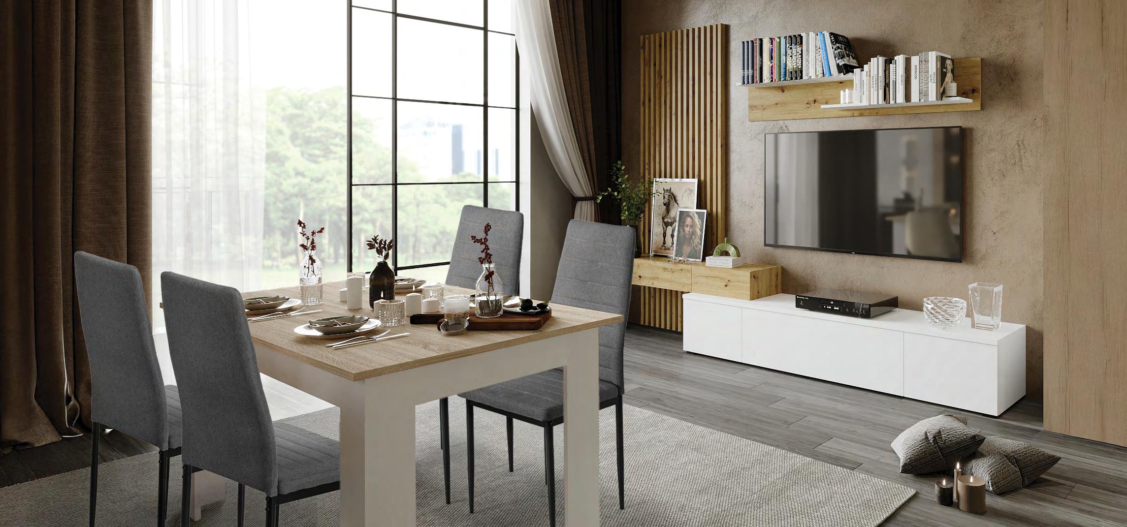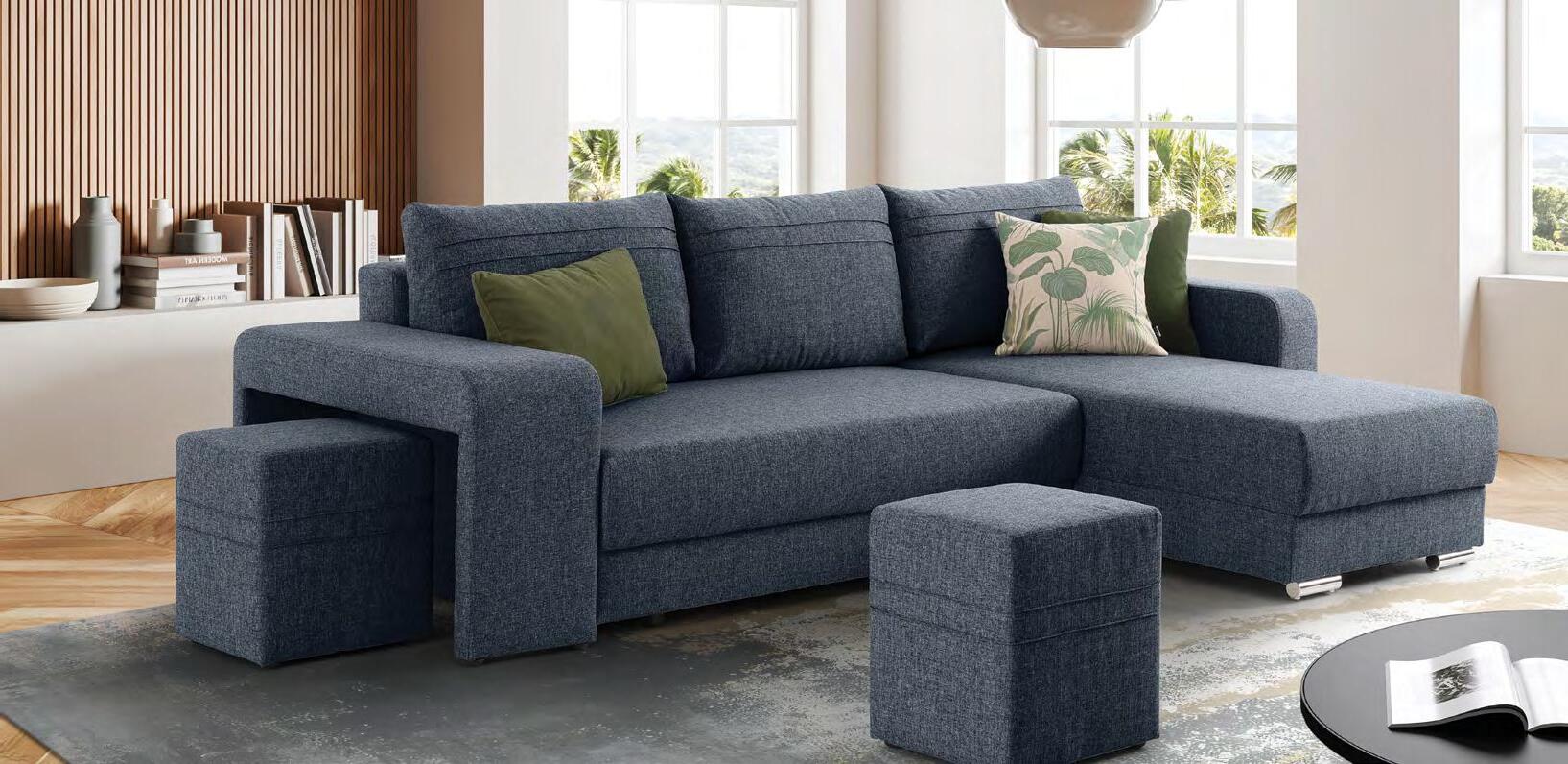 €1.590 Kotna sedežna VEGA, vzmeteno, 271x164cm, univerzalna postavitev ležišče, predal, 2x tabure, blago HYGGE 90 siva, 96 tem. siva ali 78 tem. modra