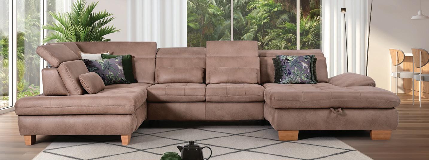 €3.466 Kotna sedežna CADIZ, 250x233cm, boxspring vzmetenje, pomično hrbtišče, mat.kat. dva HOLIDAY različne barve. Ostali materiali in kategorije za doplačilo. Nastavljivi vzglavniki ter ostale funkcije se obračunajo po rednem MPC ceniku POLIPOL.