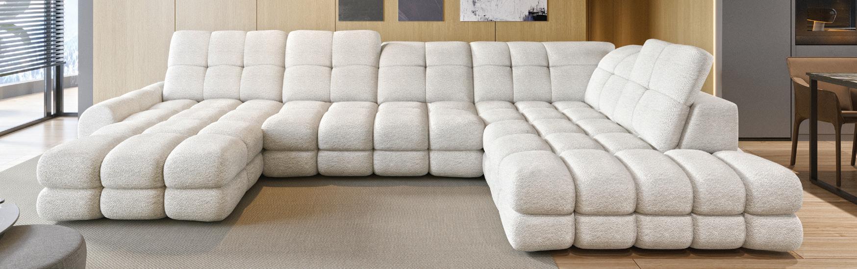 €4.190 Kotna sedežna garnitura TESSA XL, vzmeteno, 171x400x217cm, leva ali desna postavitev, električno pomično sedišče, predal, 6x nastavljiv vzglavnik, material AFRODITE različne barve