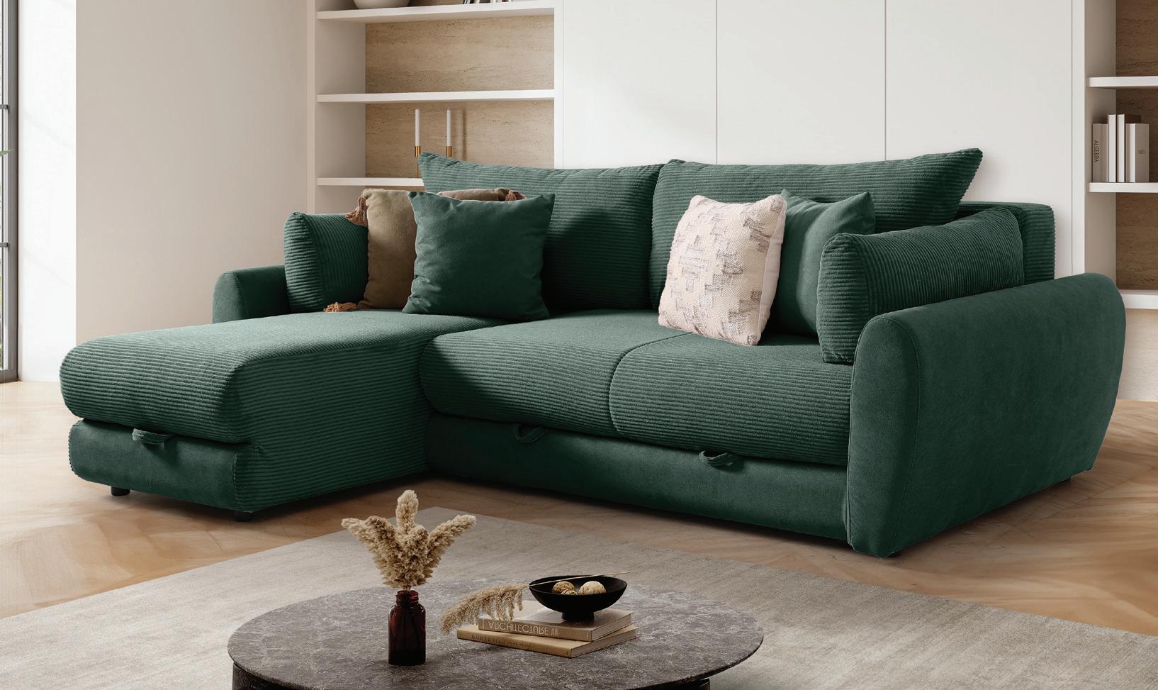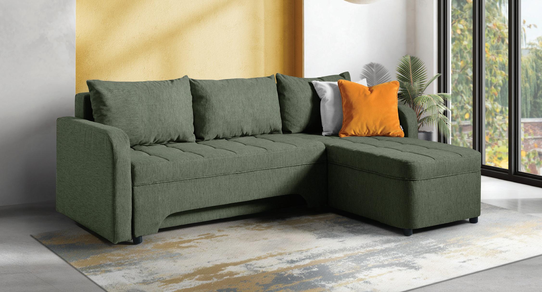 €551 Kotna sedežna garnitura HANA RN, 220x150cm, leva ali desna postavitev, ležišče 130x200cm, predal, material COMB 135 zelena ali 118 temno siva