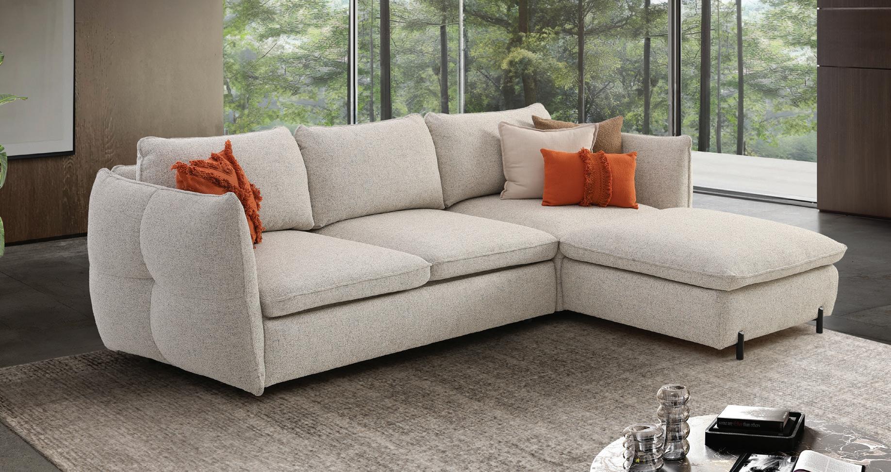 €835 Kotna sedežna garnitura RIVER, 226x276cm, leva ali desna postavitev, ležišče, material COMB 101 bež, 104 mocca ali 135 olivno zelena