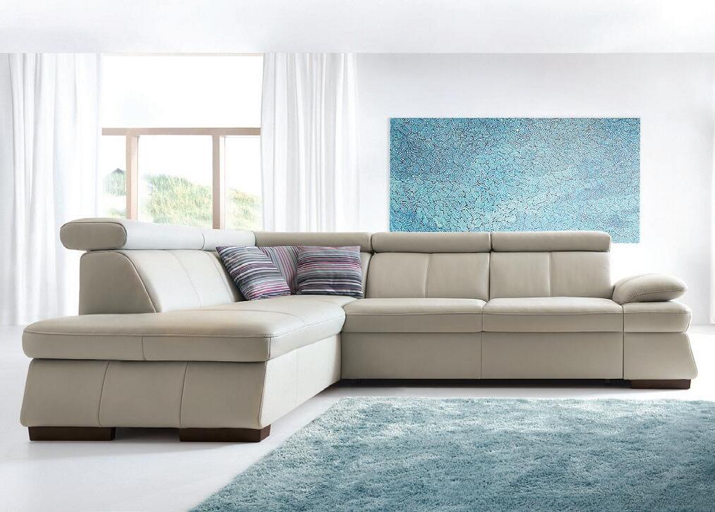 €3.189 Usnjena kotna sedežna garnitura BARI, 196x243cm, leva ali desna postavitev, ležišče, predal, 5x nastavljiv vzglavnik, usnje/um.usnje 516 taupe
