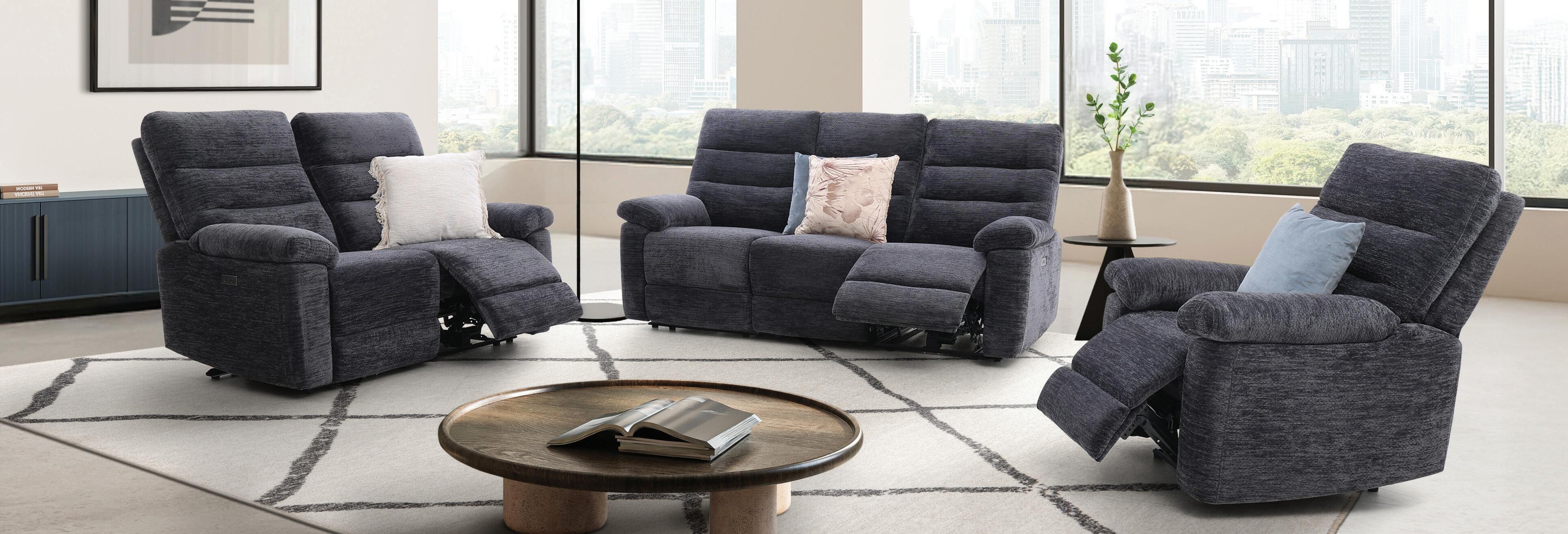€2.167 Usnjen 3-sed KEVIN, 220x76cm, 2x električni počivalnik, usnje/um.usnje siva
