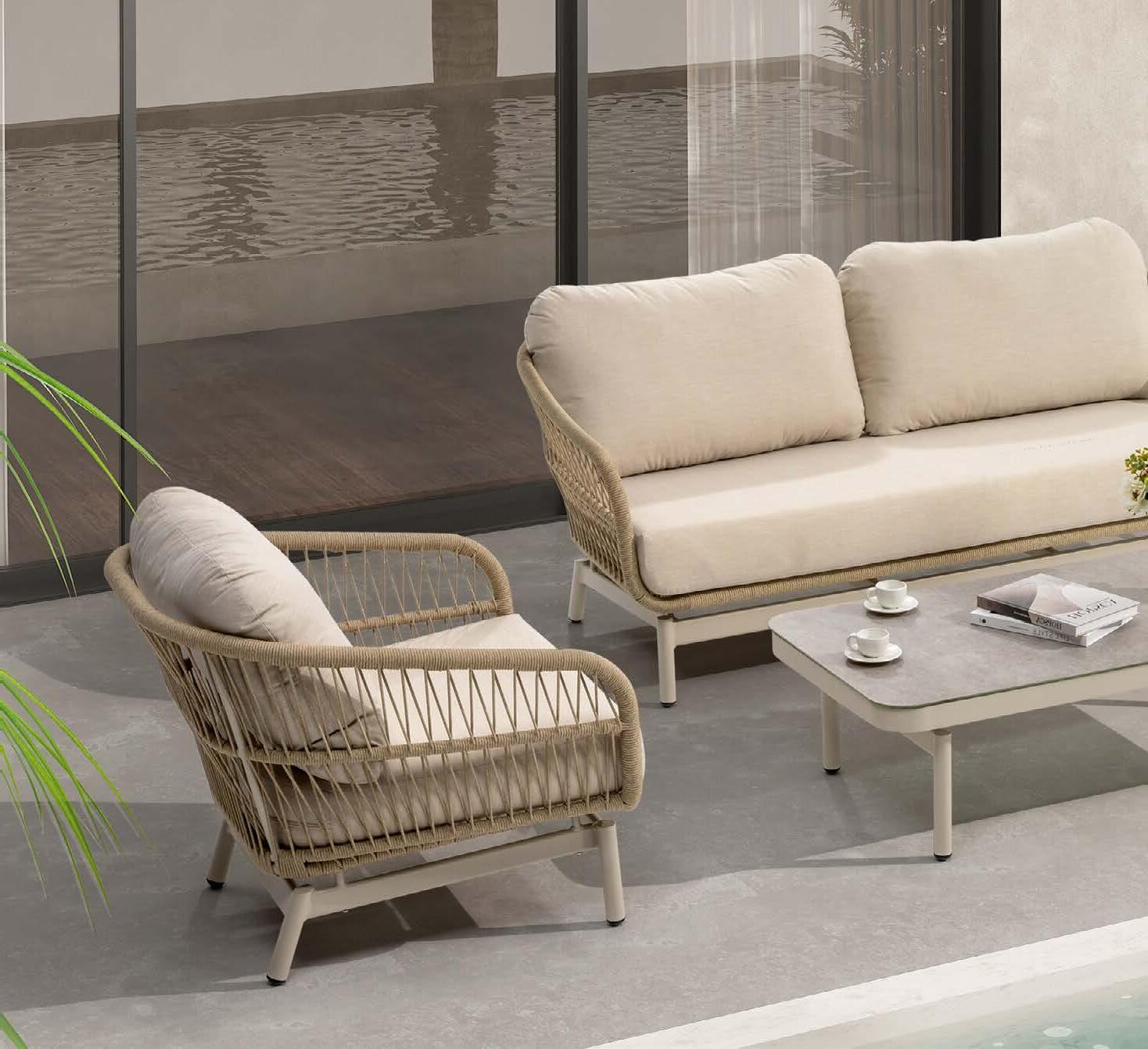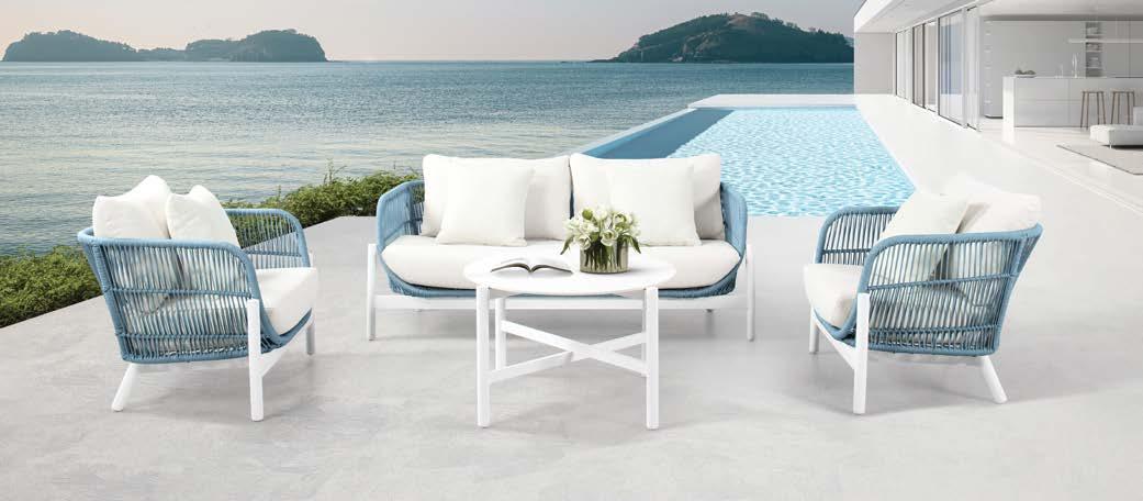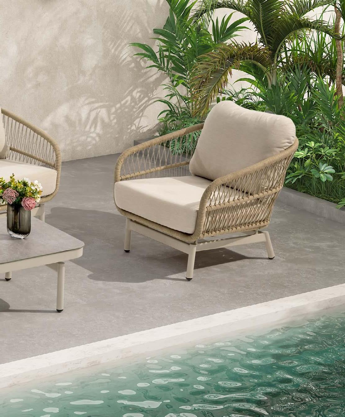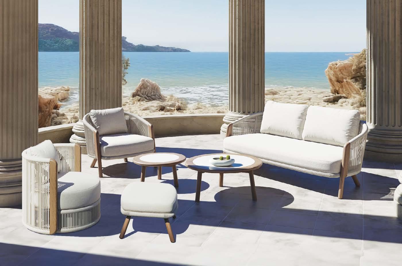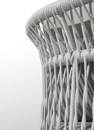 2-sed z blazinami 180x90cm, fotelj z blazinami 81x79cm, vrtljiv fotelj z blazinami 91x80cm, tabure z blazino 60x52cm, mizica premer 80cm in mizica premer 60cm, aluminij/tik/vrv