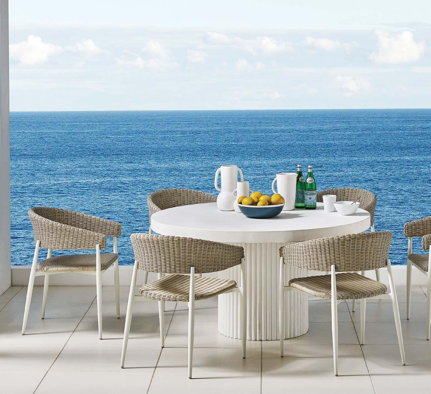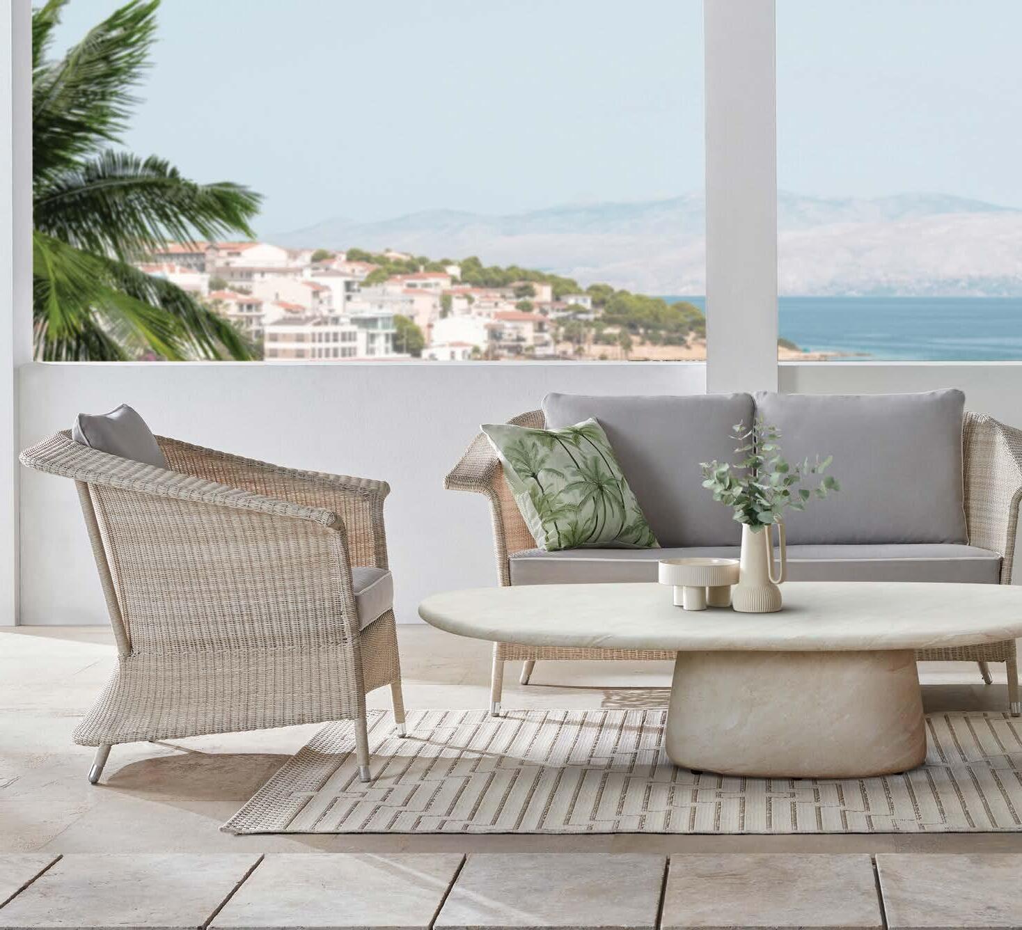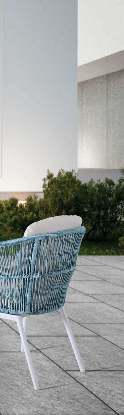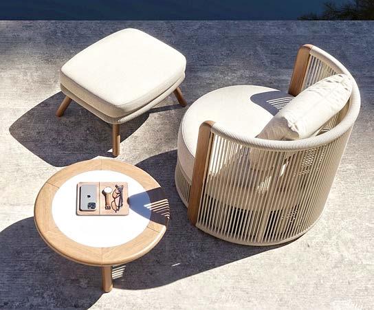 2-sed z blazinami 180x90cm, fotelj z blazinami 81x79cm, vrtljiv fotelj z blazinami 91x80cm, tabure z blazino 60x52cm, mizica premer 80cm in mizica premer 60cm, aluminij/tik/vrv