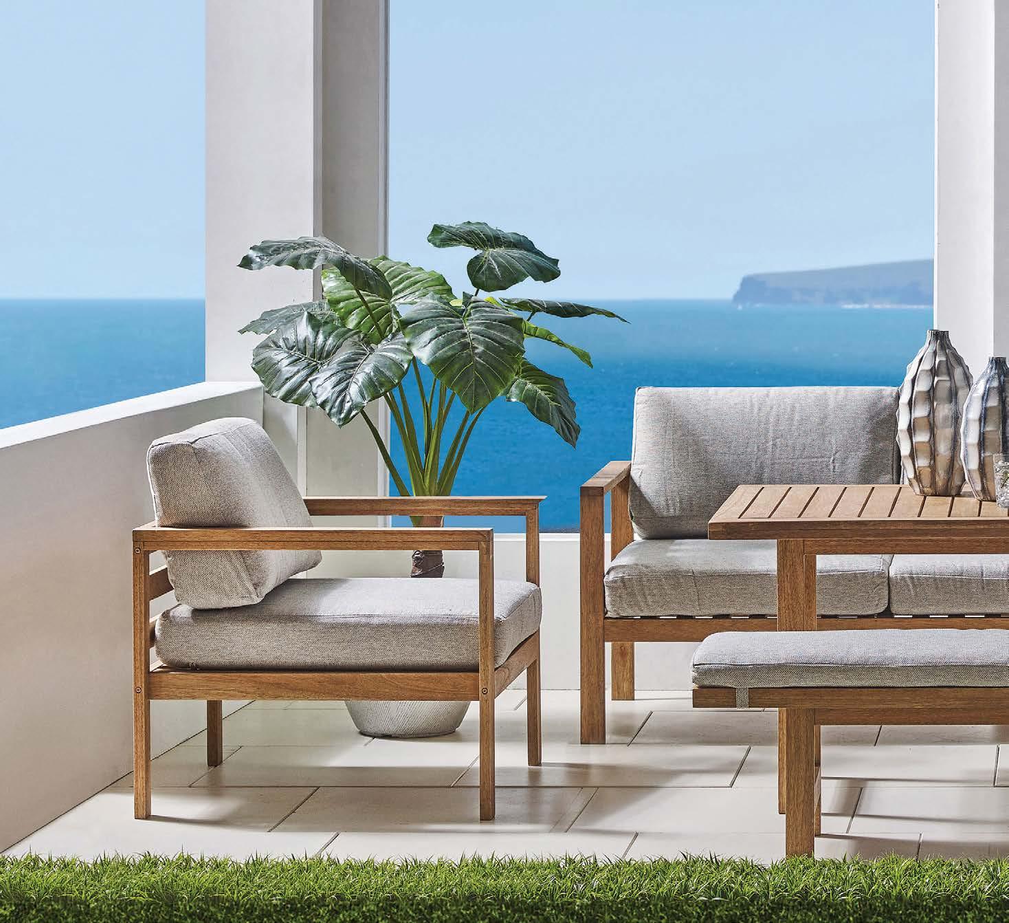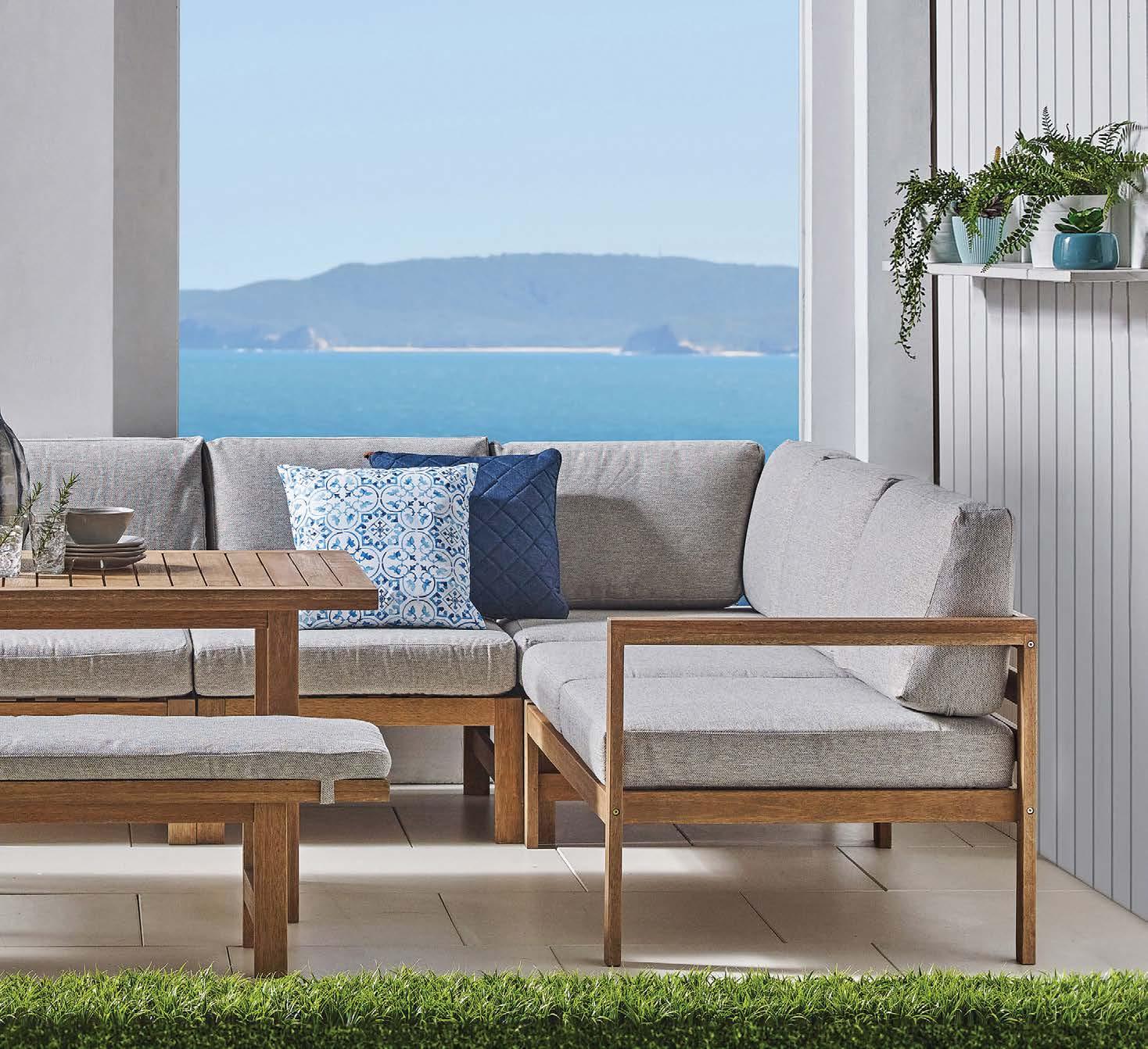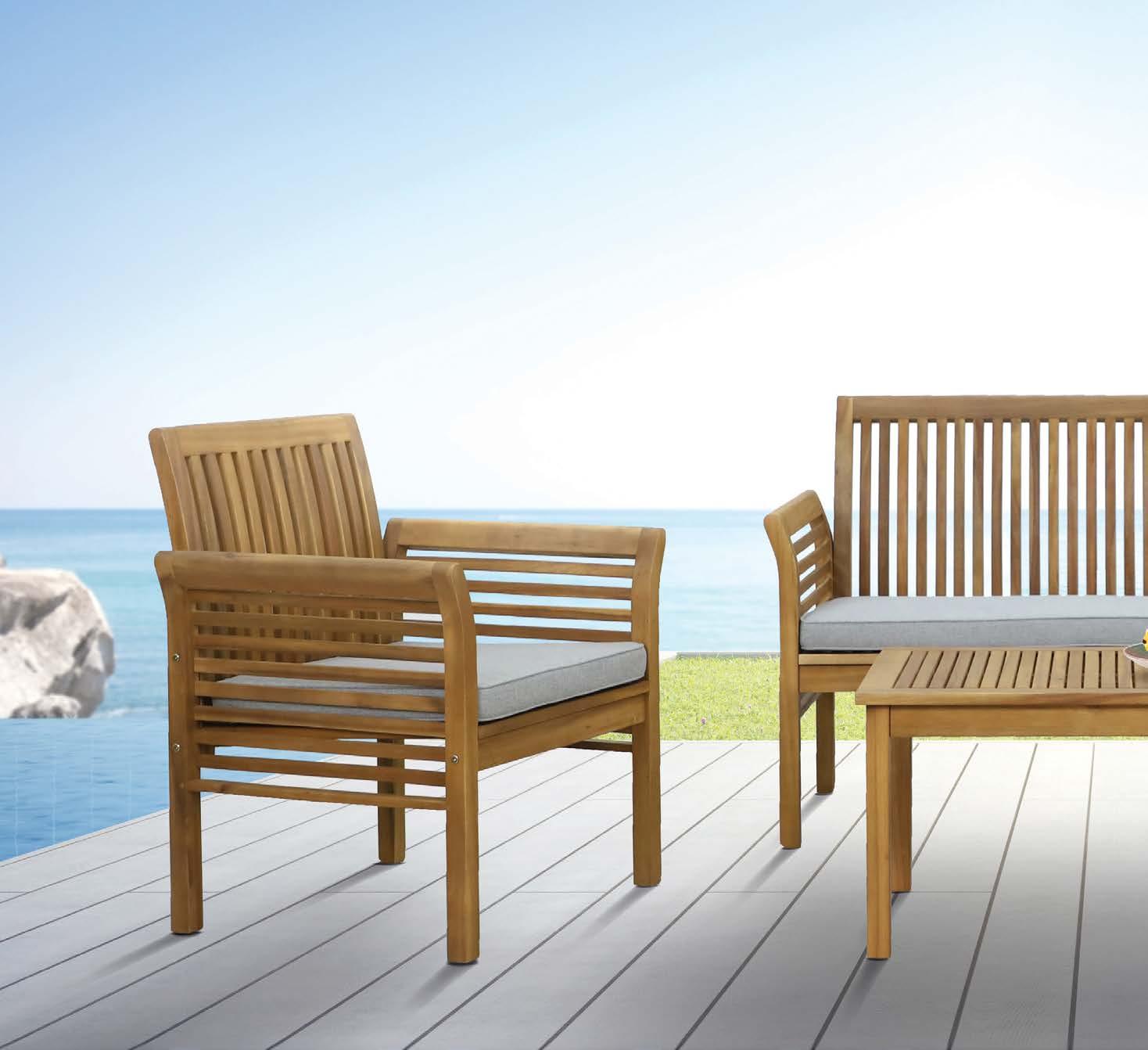 miza 85x160cm, kotna sedežna garnitura 294x224cm z blazinami, fotelj 78x78cm z blazinami in klop 159x40cm, eukaliptus