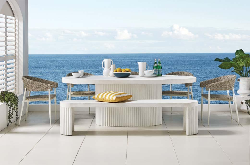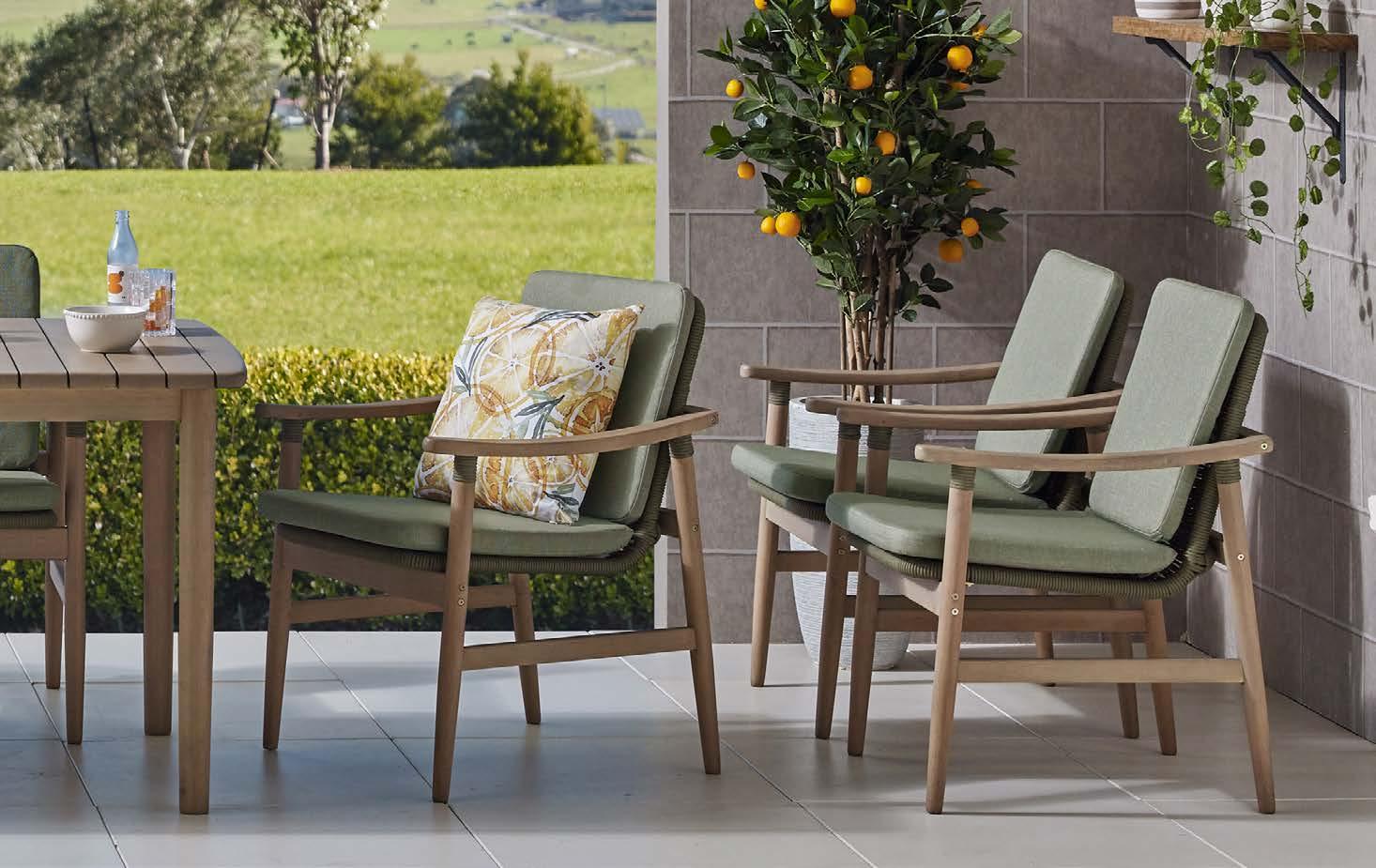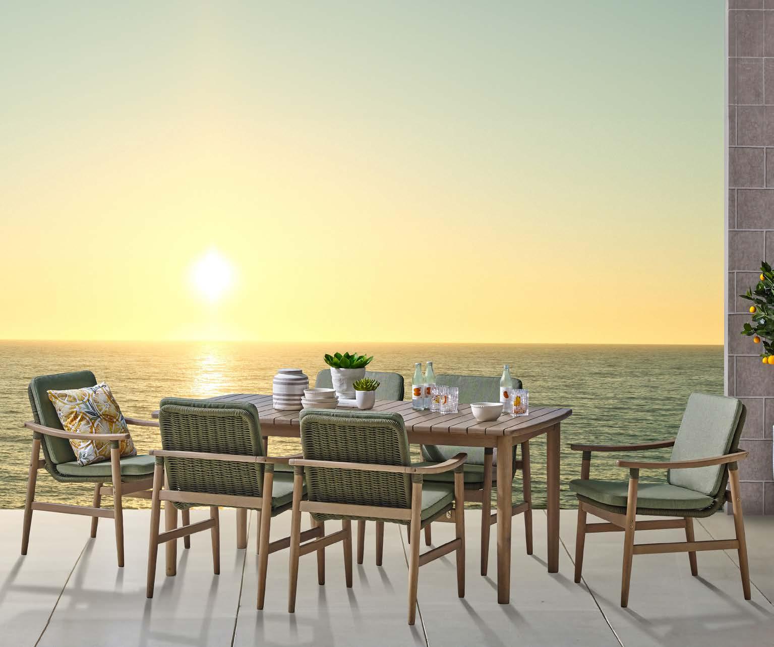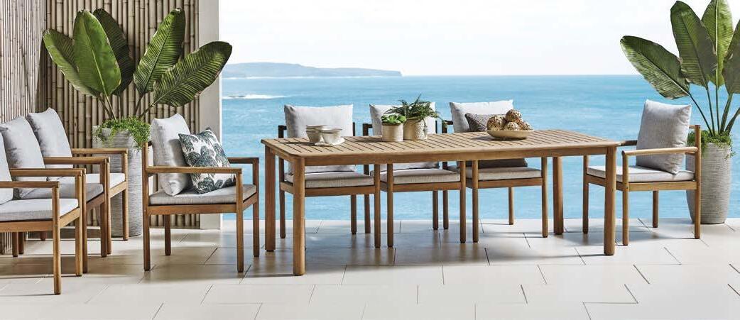 miza 85x160cm, kotna sedežna garnitura 294x224cm z blazinami, fotelj 78x78cm z blazinami in klop 159x40cm, eukaliptus