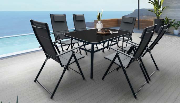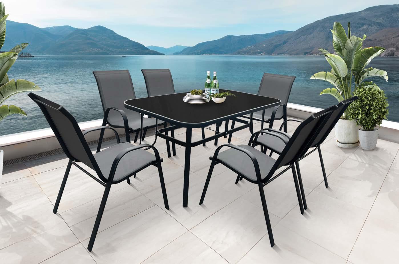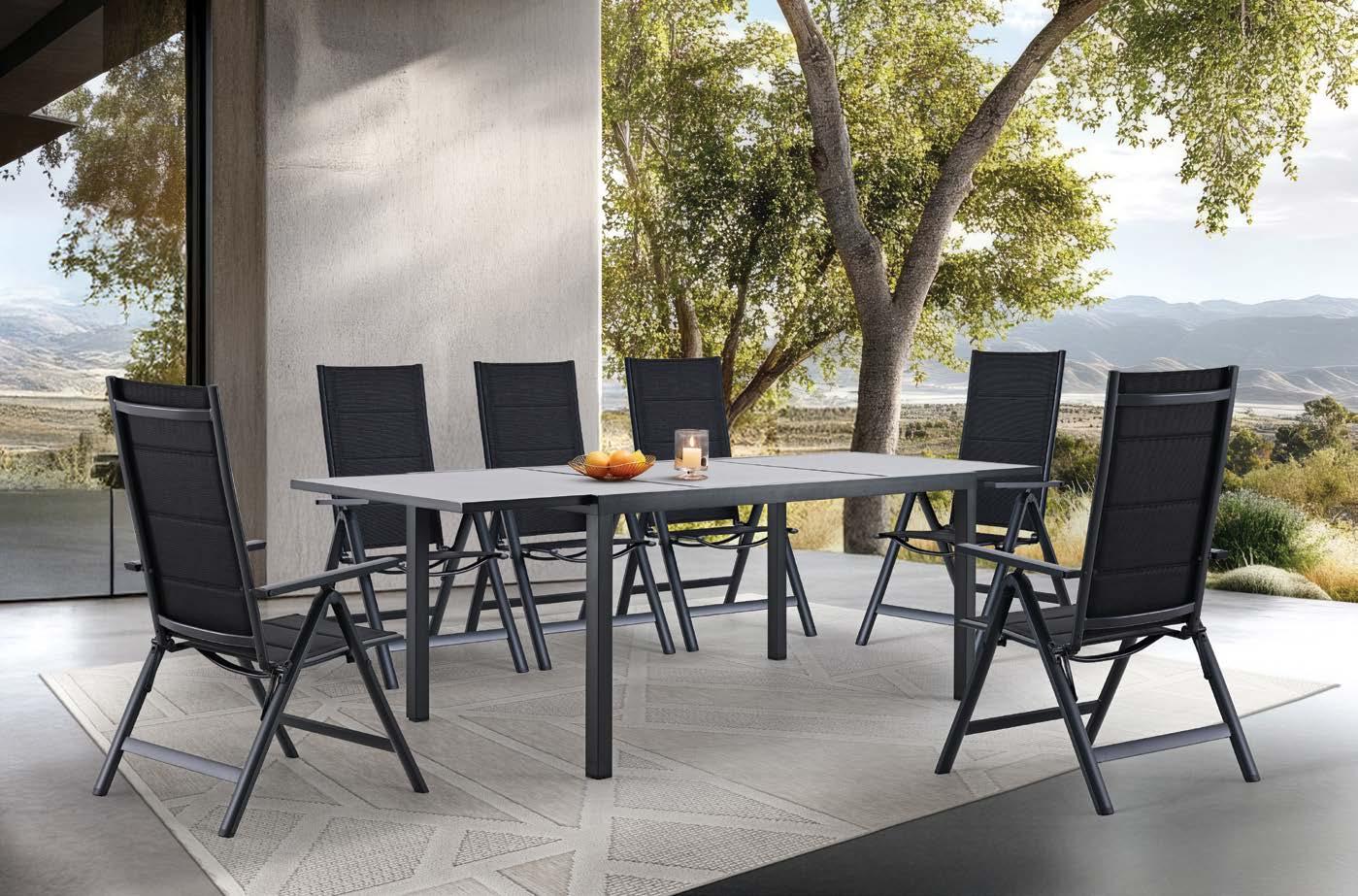Set LIGO, 9 kosov, miza 100x219cm, 8x stol z blazinami, aluminij, črna/črne blazine ali črna/zelene blazine