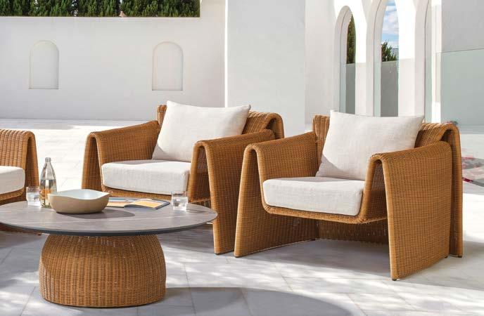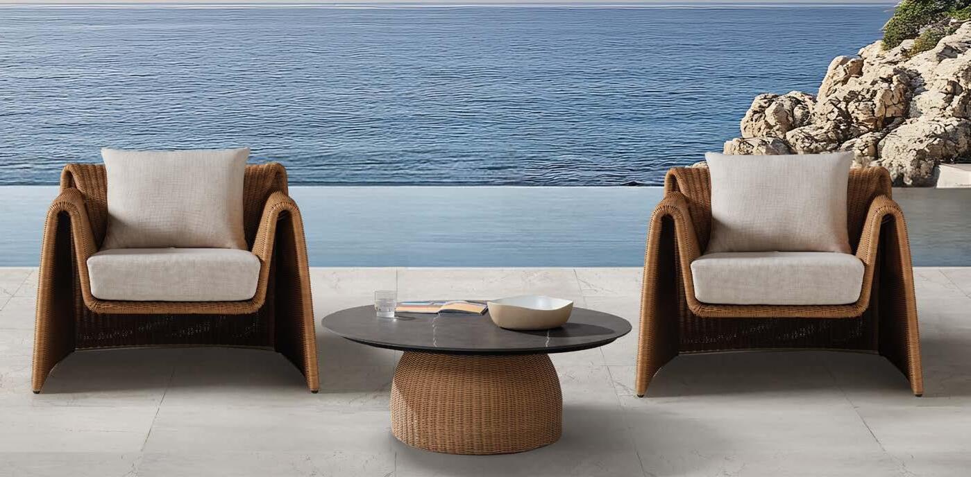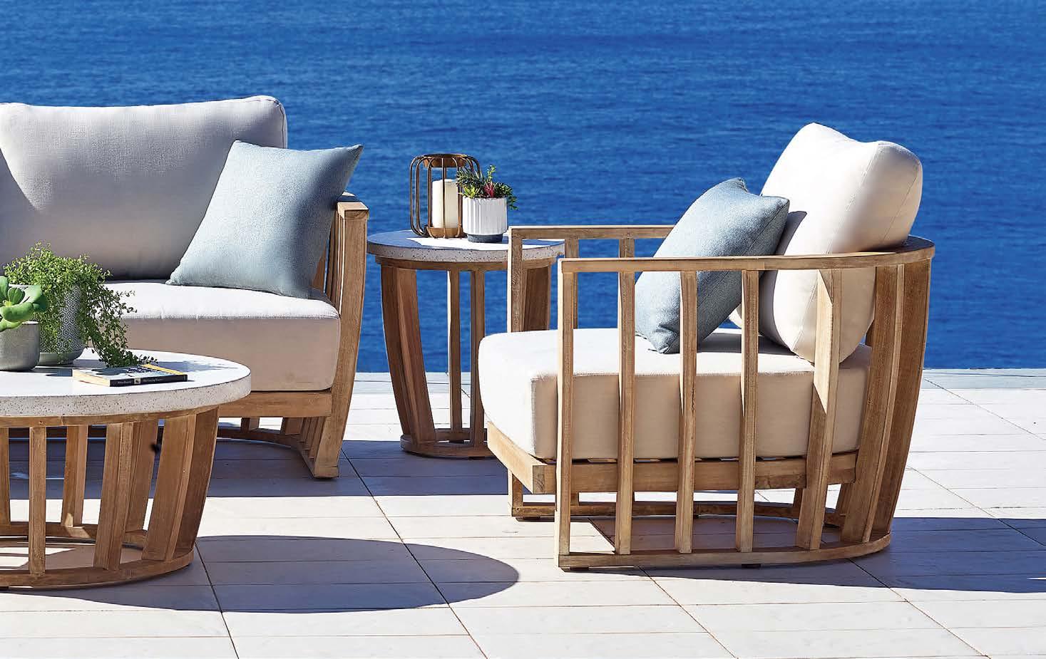 2x fotelj z blazinami 92x100cm, stranska mizica premer 50cm, terrazzo plošča, eukaliptus